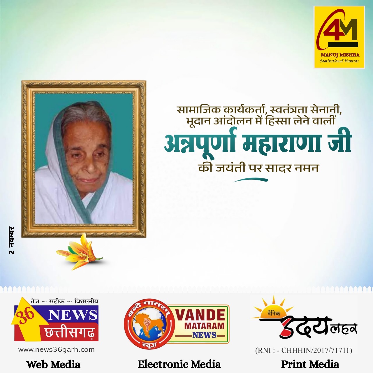 हर साल 3 नवंबर को हम अन्नपूर्णा महाराणा जी की जयंती पर उन्हें श्रद्धा के साथ याद करते हैं। वे न सिर्फ ओडिशा की, बल्कि पूरे भारतवर्ष की उन महान महिलाओं में शामिल थीं, जिन्होंने देश की आज़ादी के लिए अपना सर्वस्व समर्पित कर दिया।