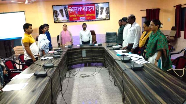 एमसीबी/ राष्ट्रगीत “वंदे मातरम्” के 150 वर्ष पूर्ण होने के उपलक्ष्य में आज मनेंद्रगढ़-चिरमिरी-भरतपुर जिले में “वंदे मातरम् स्मरणोत्सव” का आयोजन पूरे गरिमामय और उत्साहपूर्ण वातावरण में किया गया। मुख्य समारोह जनपद पंचायत मनेंद्रगढ़ के अमृत सदन सभाकक्ष में आयोजित हुआ, जहां कलेक्टर डी. राहुल वेंकट ने अधिकारियों और कर्मचारियों तथा जन प्रतिनिधियों के साथ राष्ट्रगीत का सामूहिक गायन कर कार्यक्रम का नेतृत्व किया। इस अवसर पर जिला पंचायत सीईओ श्रीमती अंकिता सोम शर्मा, एसडीएम लिंगराज सिदार, जनपद सीईओ सुश्री वैशाली सिंह सहित सभी विभागों के अधिकारी, कर्मचारी एवं नागरिक बड़ी संख्या में उपस्थित रहे।