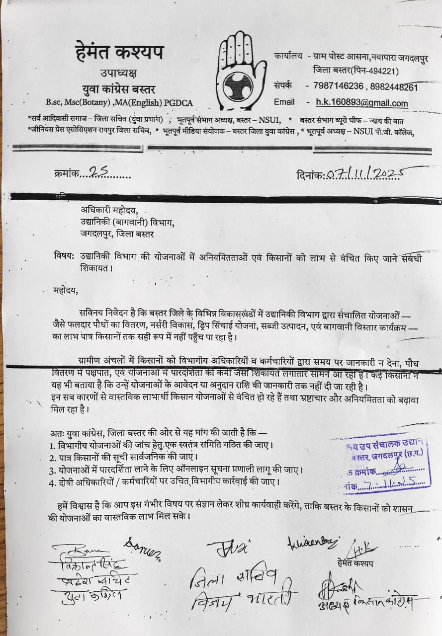 युवा कांग्रेस, जिला बस्तर ने अपनी मांगों में कहा है कि विभागीय योजनाओं की जांच हेतु स्वतंत्र समिति गठित की जाए, पात्र किसानों की सूची सार्वजनिक की जाए, योजनाओं में पारदर्शिता के लिए ऑनलाइन सूचना प्रणाली लागू की जाए और दोषी अधिकारियों एवं कर्मचारियों पर विभागीय कार्रवाई की जाए। इस अवसर पर उप संचालक उद्यानिकी आकांक्षा सिन्हा ने ज्ञापन प्राप्त कर मामले को संज्ञान में लेते हुए किसानों को विभागीय योजनाओं का शीघ्र लाभ दिलाने का आश्वासन दिया। इस दौरान युवा कांग्रेस जिला उपाध्यक्ष हेमंत कश्यप, प्रदेश सचिव विक्रांत सिंह, किसान कांग्रेस जिलाध्यक्ष दयाराम कश्यप, खिरेंद्र यादव एवं समीर खान मौजूद थे। युवा कांग्रेस ने आशा व्यक्त की है कि विभाग इस गंभीर विषय पर शीघ्र ठोस कार्रवाई करेगा, जिससे बस्तर के किसानों को शासन की योजनाओं का वास्तविक लाभ मिल सके।