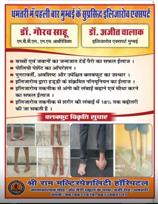 क्लबफुट विकृति सुधार OMI Y MERA श्री राम मल्टिस्पेशलिटी हॉस्पिटल,आमातालाब मोड़, सेंट मेरी स्कूल के पास, रुद्री रोड, धमतरी में होंगे।