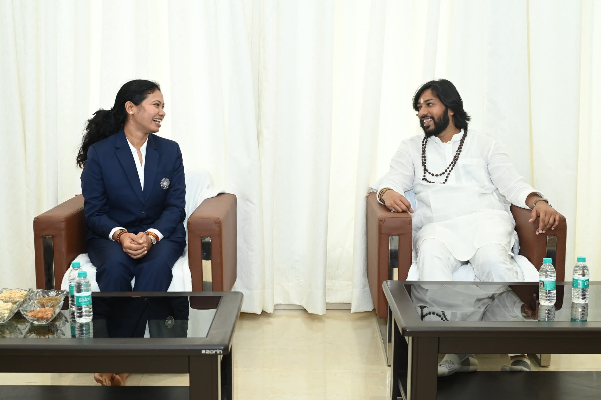 छत्तीसगढ़ राज्य के कौशल विकास, तकनीकी शिक्षा,रोजगार एवं अनुसूचित जाति विकास मंत्री, आरंग विधायक एवं सतनामी समाज के गुरु खुशवंत साहेब से आज भारतीय महिला क्रिकेट टीम की फिजियोथैरेपिस्ट एवं स्पोर्ट्स साइंस विशेषज्ञ सुश्री आकांक्षा सत्यवंशी ने उनके नवीन आवास M3, नवा रायपुर में सौजन्य भेंट की। मुलाकात के दौरान आकांक्षा सत्यवंशी ने गुरुगद्दी की पूजा-अर्चना कर गुरु खुशवंत साहेब को श्रीफल भेंट कर आशीर्वाद प्राप्त किया। गुरु खुशवंत साहेब ने भी गुरु धर्म का निर्वहन करते हुए शुभाशीष प्रदान किया और शाल व स्मृति चिन्ह भेंट कर भारतीय महिला क्रिकेट टीम की ऐतिहासिक विश्वकप जीत में उनके अमूल्य योगदान के लिए हार्दिक बधाई एवं शुभकामनाएं दीं।