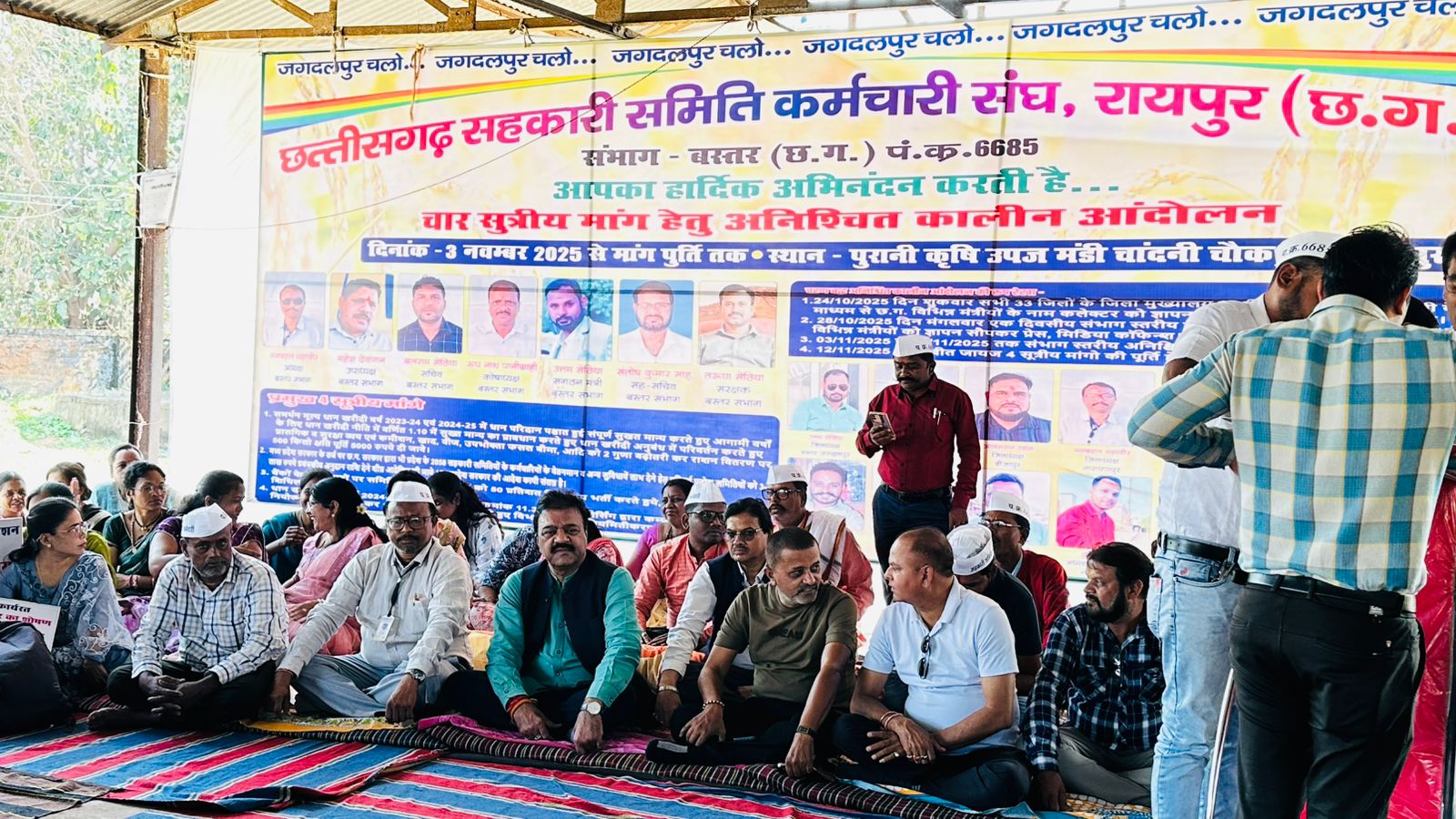 बस्तर संभाग सहकारी समिति कर्मचारी संघ द्वारा जगदलपुर के कृषि ऊपज मंडी प्रांगण में अपनी चार सूत्रीय मांग को लेकर अनिश्चित कालीन धरना प्रदर्शनकिया जा रहा है। आज जगदलपुर के पूर्व विधायक एवं संसदीय सचिव रेखचंद जैन ने हड़ताल पर बैठे कर्मचारियों की मांगो का धरना स्थल पर पहुंच कर समर्थन किया।