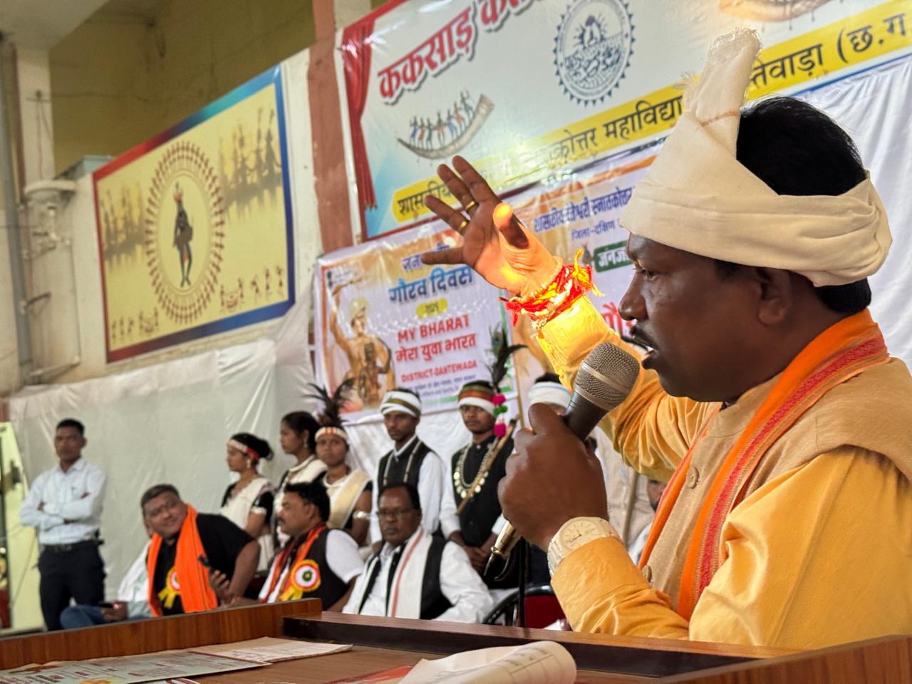 मुख्य वक्ता गोरख नाथ बघेल एवं अन्य अतिथियों का भी पुष्पगुच्छ भेंटकर स्वागत किया गया | कार्यक्रम की शुरुवात भारत माता,छत्तीसगढ़ महतारी,धरती आंबा भगवान बिरसा मुंडा जी के छायाचित्र पर पुष्प अर्पित एवं दिप प्रज्वलित कर किया गया | कार्यक्रम को संबोधत करते हुए बस्तर सांसद महेश कश्यप ने कहा की जनजाति गौरव दिवस केवल भगवान बिरसा मुंडा ही नहीं, आदिवासी समाज में जन्मे असंख्य महापुरुषों को समर्पित ह,ब्रिटिश हुकूमत द्वारा अपने जल, जंगल, ज़मीन, जनजाति पहचान एवं स्वतंत्रता पर संकट देखकर उसके रक्षण के लिए शोषणवादी अंग्रेजी सत्ता के विरोध में “उलगुलान” आंदोलन करने वाले धरती आबा की उपाधि से विभूषित भगवान बिरसा मुंडा की यह 150 वी जयंती का वर्ष है । उनका जन्म 15 नवम्बर 1875 को अलिहातू ग्राम जनपद राँची में हुआ था। अंग्रेजों के खिलाफ़ सशस्त्र विद्रोह करने के कारण वह गिरफ्तार हुए एवं जेल में ही 9 जून 1900 को उनका बलिदान हो गया । उनकी संघर्षमय स्मृति को चिरस्थायी रूप देने एवं उनसे युवा पीढ़ी प्रेरणा प्राप्त कर सके, इसके लिए प्रधानमंत्री श्री नरेंद्र मोदी जी ने 15 नवंबर को “जनजातीय गौरव दिवस” घोषित किया है | भगवान बिरसा मुंडा ने दुर्व्यसनों से रहित जीवन , अंधविश्वास से मुक्ति एवं अपनी भूमि के प्रति स्वाभिमान का भाव जनजाति समाज को सिखाया। उन्होंने शोषण के प्रति आवाज उठाते हुए बेगारी प्रथा का विरोध किया। ब्रिटिश सत्ता को लगान न देने का आह्वान कर उन्होंने उलगुलान आंदोलन कों प्रारंभ किया। उनका नारा था “अबुआ राज़ एते जाना, महारानी राज टुंडू जीना।”( हमारा शासन शुरू हो, रानी का शासन समाप्त हो ।)