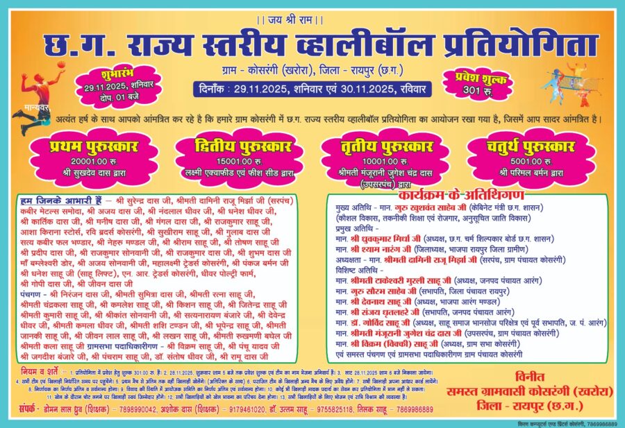 सोमन साहू/आरंग कोसरंगी — ग्राम कोसरंगी में 29 नवंबर को छत्तीसगढ़ राज्य स्तरीय वॉलीबॉल प्रतियोगिता का भव्य आयोजन किया गया। कार्यक्रम के मुख्य अतिथि के रूप में गुरु खुशवंत साहेब, केबिनेट मंत्री, छत्तीसगढ़ शासन उपस्थित रहेंगे। प्रमुख अतिथियों में ध्रुवकुमार मिर्धा, अध्यक्ष छत्तीसगढ़ चर्म शिल्पकार बोर्ड (राज्यमंत्री दर्जा प्राप्त) एवं श्याम नारंग, जिलाध्यक्ष भाजपा जिला रायपुर ग्रामीण शामिल होंगे।
