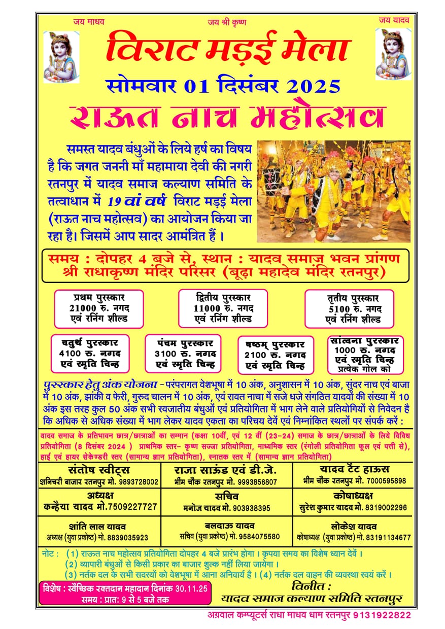 यादव समाज कल्याण समिति रतनपुर के द्वारा आयोजित किया जा रहा रक्तदान शिविरों में रक्तदान कर समाज के लोग दूसरों की जान बचाते हैं। यह एक निस्वार्थ सेवा कार्य है, जो समुदाय के स्वास्थ्य को बेहतर बनाने में मदद करता है। रतनपुर मे यादव समाज हर साल एक विशिष्ट तिथि 01 दिसम्बर 2025 दिन सोमवार को 04 बजे से विराट मड़ई रावत नाच महोत्सव का आयोजन किया जाएगा l
