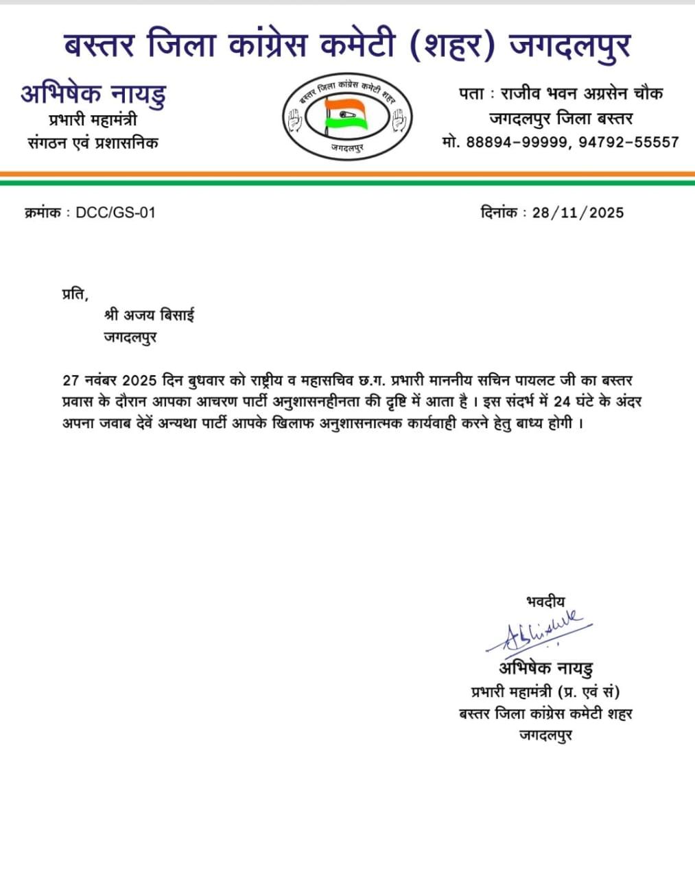 जगदलपुर। युवा कांग्रेस के पूर्व शहर जिला अध्यक्ष अजय बिसाई को अनुशासनहीनता पर कारण बताओ नोटिस जारी किया गया है। शहर जिला कांग्रेस कमेटी के प्रभारी महामंत्री (प्रशासनिक एवं संगठन) अभिषेक नायडू द्वारा जारी नोटिस में कहा गया है कि प्रदेश कांग्रेस कमेटी के प्रभारी सचिन पायलट के जगदलपुर प्रवास के दौरान अजय बिसाई का आचरण अनुशासनहीनता की श्रेणी में आता है। श्री नायडू ने अजय बिसाई को 24 घंटे ने स्पष्टीकरण देने कहा गया है। ज्ञात हो कि अजय बिसाई को पूर्व आबकारी मंत्री कवासी लखमा का समर्थक माना जाता है।