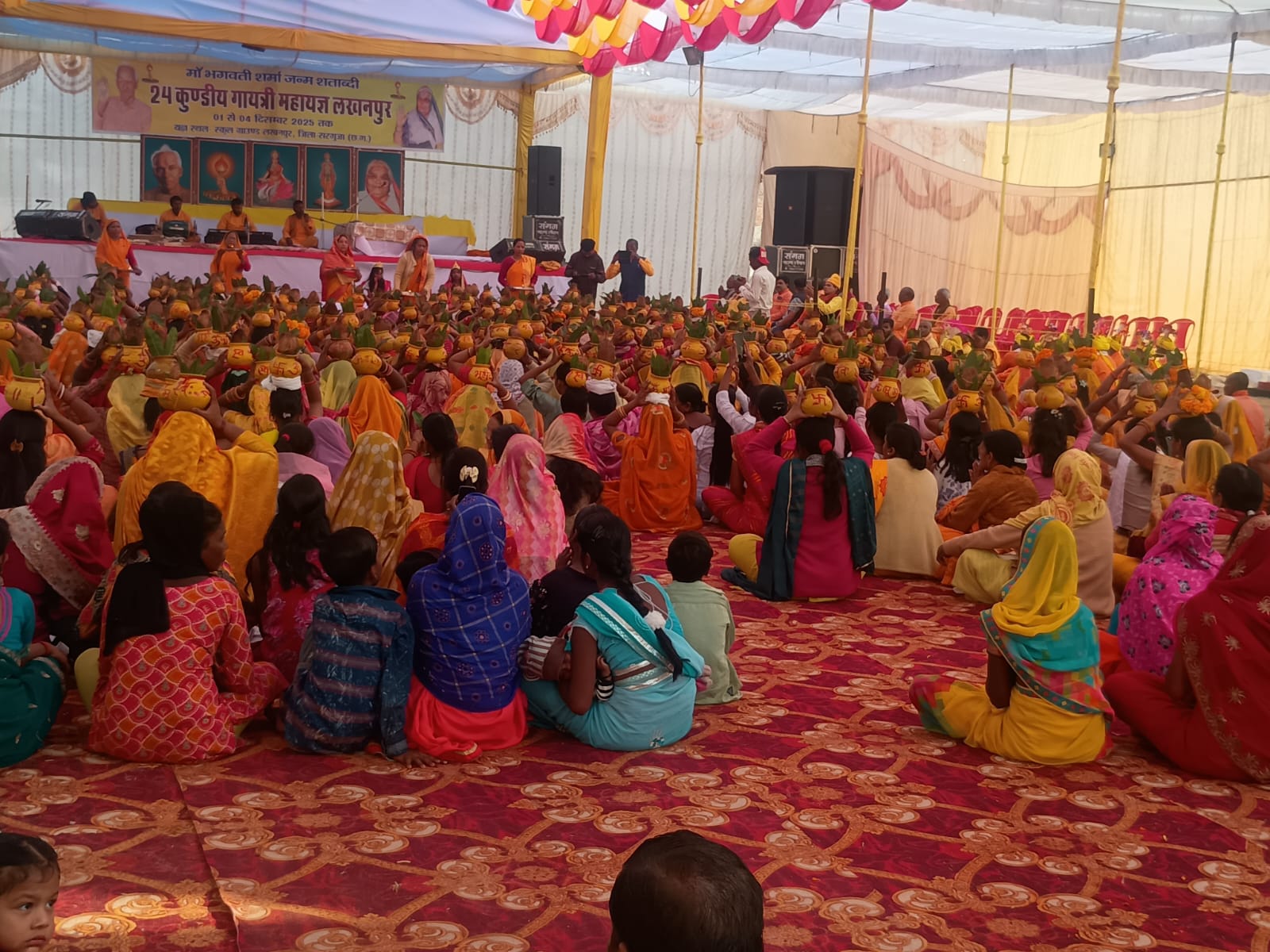 शांति कुंज हरिद्वार( उत्तराखंड) की टोली एवं गायत्री परिवार लखनपुर के संयुक्त तत्वावधान में मां भगवती शर्मा जन्म शताब्दी पर राष्ट्र जागरण शक्ति संवर्धन गायत्री महायज्ञ का शुभारंभ 1 दिसम्बर 2025 से लखनपुर के हाई स्कूल साक्षरता मिनी स्टेडियम में आरंभ हुई। युग ऋषि वेद मूर्ति तपोनिष्ट परम पूज्य गुरुदेव पंडित श्रीराम शर्मा आचार्य जी एवं परम वन्दनीया माता जी भगवती देवी शर्मा के दिव्य एवं सूक्ष्म संरक्षण में ईश्वरीय योजना हमारी ऋषि प्रणीत भारतीय संस्कृति के उत्थान हेतु 24 कुण्डीय गायत्री महायज्ञ के शुभारंभ में पहले दिन सोमवार को प्राचीन राममंदिर (ठाकुर बाडी) से गाजे बाजे के साथ भव्य कलश यात्रा निकाली गई जिसमें नगर लखनपुर सहित आसपास ग्रामीण क्षेत्रों से आये श्रद्धालु माताओं बहनों ने बढ़ चढ़ कर भाग लिया।
