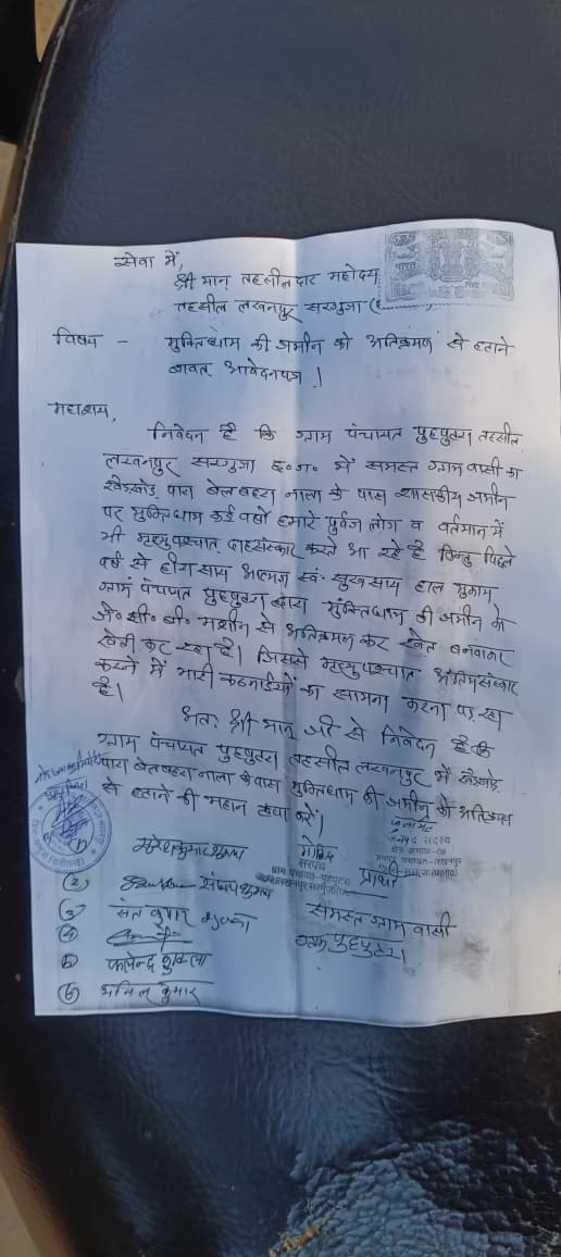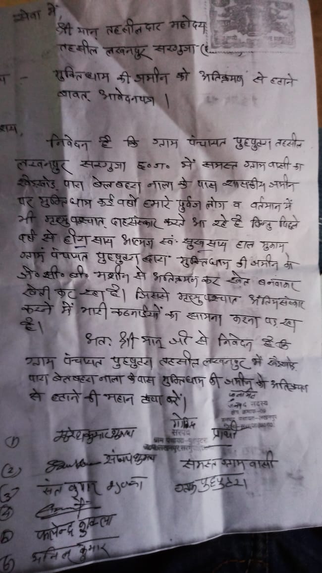 तहसील लखनपुर क्षेत्र के ग्राम पंचायत पुहपुटरा के श्मशान भूमि पर गांव के ही एक दबंग व्यक्ति द्वारा नाजायज़ तरीके से कब्जा कर कास्तकारी किया जा रहा है। मरघट भूमि पर किये गये अवैध कब्जे को लेकर पंचायत वासियों में काफी रोष है। दरअसल श्मशान भूमि को पुस्त -दर- पुस्त पूर्वजों ने दाह-संस्कार के लिए सुरक्षित बचाये रखा है।