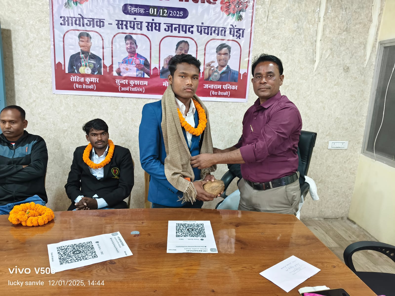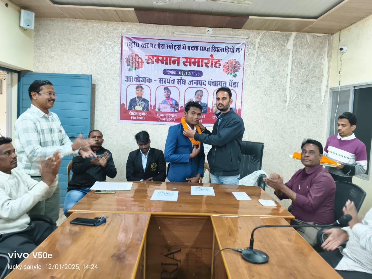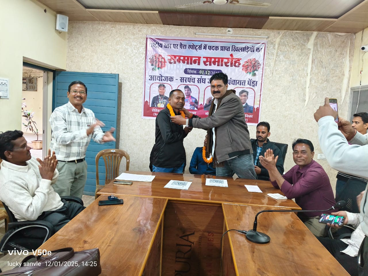 आज सरपंच संघ जनपद पंचायत पेंड्रा द्वारा विभिन्न राष्ट्रीय स्तर की खेल प्रतियोगिता में पदक (मेडल) प्राप्त गौरेला पेण्ड्रा मरवाही जिले के दिव्यांग खिलाड़ियों को जिन्होंने जिले के के साथ साथ छत्तीसगढ़ का नाम रोशन किया उनका भव्य सम्मान समारोह का आयोजन जनपद पंचायत पेंड्रा के सभा कक्ष में आयोजित किया गया वर्ष 2025-26 में रोहित कुमार ग्राम पनकोटा द्वारा दो स्वर्ण,एक रजत पदक , जन्तराम पनिका ग्राम सोनबचरवार द्वारा एक कांस्य पदक, कु. मोहनी मरावी ग्राम देवरगांव द्वारा एक कांस्य पदक सभी 25 वीं राष्ट्रीय पैरा दिव्यांग स्वीमिंग प्रतियोगिता हैदराबाद (तेलंगाना) में प्राप्त करने पर एवं सुंदर सिंह कुशराम ग्राम आमगांव (बस्ती बगरा) को 37 वीं राष्ट्रीय आर्म रेसलिंग प्रतियोगिता लुधियाना (पंजाब) में एक स्वर्ण पदक, प्राप्त करने पर सम्मानित किया गया। उपरोक्त जानकारी देते हुए दिनेश सिंह दाऊ सचिव पैरा स्पोर्ट्स ने बतलाया कि सम्मान समारोह में निशांत तिवारी उपाध्यक्ष, लालचंद सोनवानी अध्यक्ष , पारस वासुदेव, दुर्गा वाकरे,श्यामवती, जानकारी पावले,अमोल सिंह, तेजकुमार ,चंद्र शेखर , अनिल धुर्वे, उपस्थित रहे