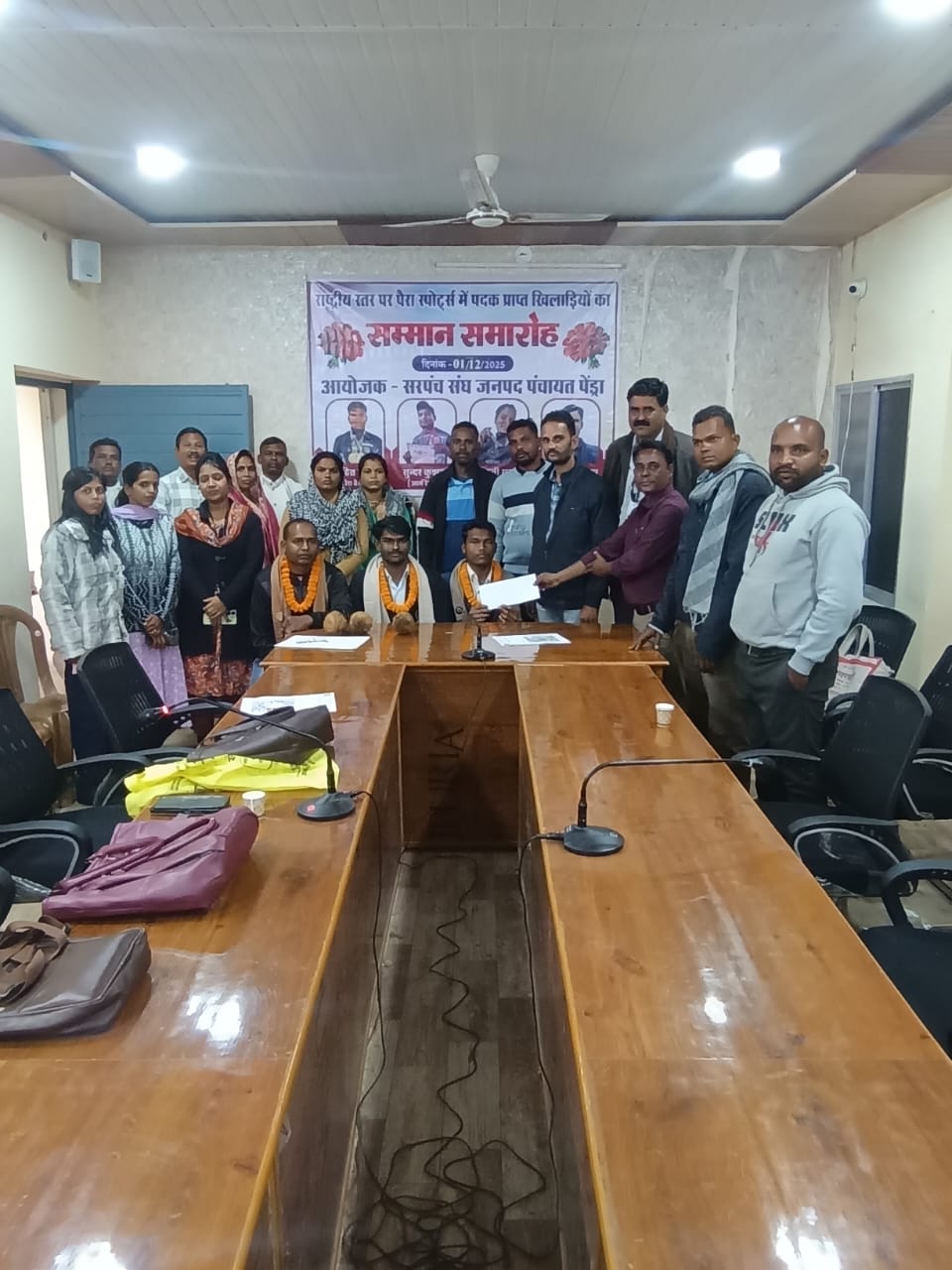 आज सरपंच संघ जनपद पंचायत पेंड्रा द्वारा विभिन्न राष्ट्रीय स्तर की खेल प्रतियोगिता में पदक (मेडल) प्राप्त गौरेला पेण्ड्रा मरवाही जिले के दिव्यांग खिलाड़ियों को जिन्होंने जिले के के साथ साथ छत्तीसगढ़ का नाम रोशन किया उनका भव्य सम्मान समारोह का आयोजन जनपद पंचायत पेंड्रा के सभा कक्ष में आयोजित किया गया वर्ष 2025-26 में रोहित कुमार ग्राम पनकोटा द्वारा दो स्वर्ण,एक रजत पदक , जन्तराम पनिका ग्राम सोनबचरवार द्वारा एक कांस्य पदक, कु. मोहनी मरावी ग्राम देवरगांव द्वारा एक कांस्य पदक सभी 25 वीं राष्ट्रीय पैरा दिव्यांग स्वीमिंग प्रतियोगिता हैदराबाद (तेलंगाना) में प्राप्त करने पर एवं सुंदर सिंह कुशराम ग्राम आमगांव (बस्ती बगरा) को 37 वीं राष्ट्रीय आर्म रेसलिंग प्रतियोगिता लुधियाना (पंजाब) में एक स्वर्ण पदक, प्राप्त करने पर सम्मानित किया गया। उपरोक्त जानकारी देते हुए दिनेश सिंह दाऊ सचिव पैरा स्पोर्ट्स ने बतलाया कि सम्मान समारोह में निशांत तिवारी उपाध्यक्ष, लालचंद सोनवानी अध्यक्ष , पारस वासुदेव, दुर्गा वाकरे,श्यामवती, जानकारी पावले,अमोल सिंह, तेजकुमार ,चंद्र शेखर , अनिल धुर्वे, उपस्थित रहे