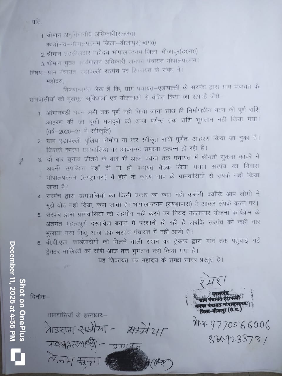 ग्रामीणों ने सरपंच के कार्यों की जांच कर उचित कार्रवाई की मांग की है। आवेदन पर तोडसम सम्मैया, गणपत तकारी, तेलम मुत्ता, उप सरपंच रमेश सहित ग्रामवासियों के हस्ताक्षर शामिल हैं।
