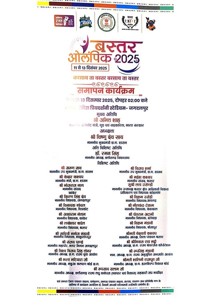 जगदलपुर। करसाय ता बस्तर, बरसाय ता बस्तर’ के प्रेरक संकल्प के साथ आयोजित प्रतिष्ठित बस्तर ओलंपिक- 2025 का समापन समारोह 13 दिसंबर को इंदिरा प्रियदर्शिनी स्टेडियम जगदलपुर में पूरी भव्यता के साथ होने जा रहा है। खेल और संस्कृति के इस महाकुंभ के समापन कार्यक्रम में देश और प्रदेश के अतिथि उपस्थित रहकर खिलाड़ियों का उत्साहवर्धन करेंगे।