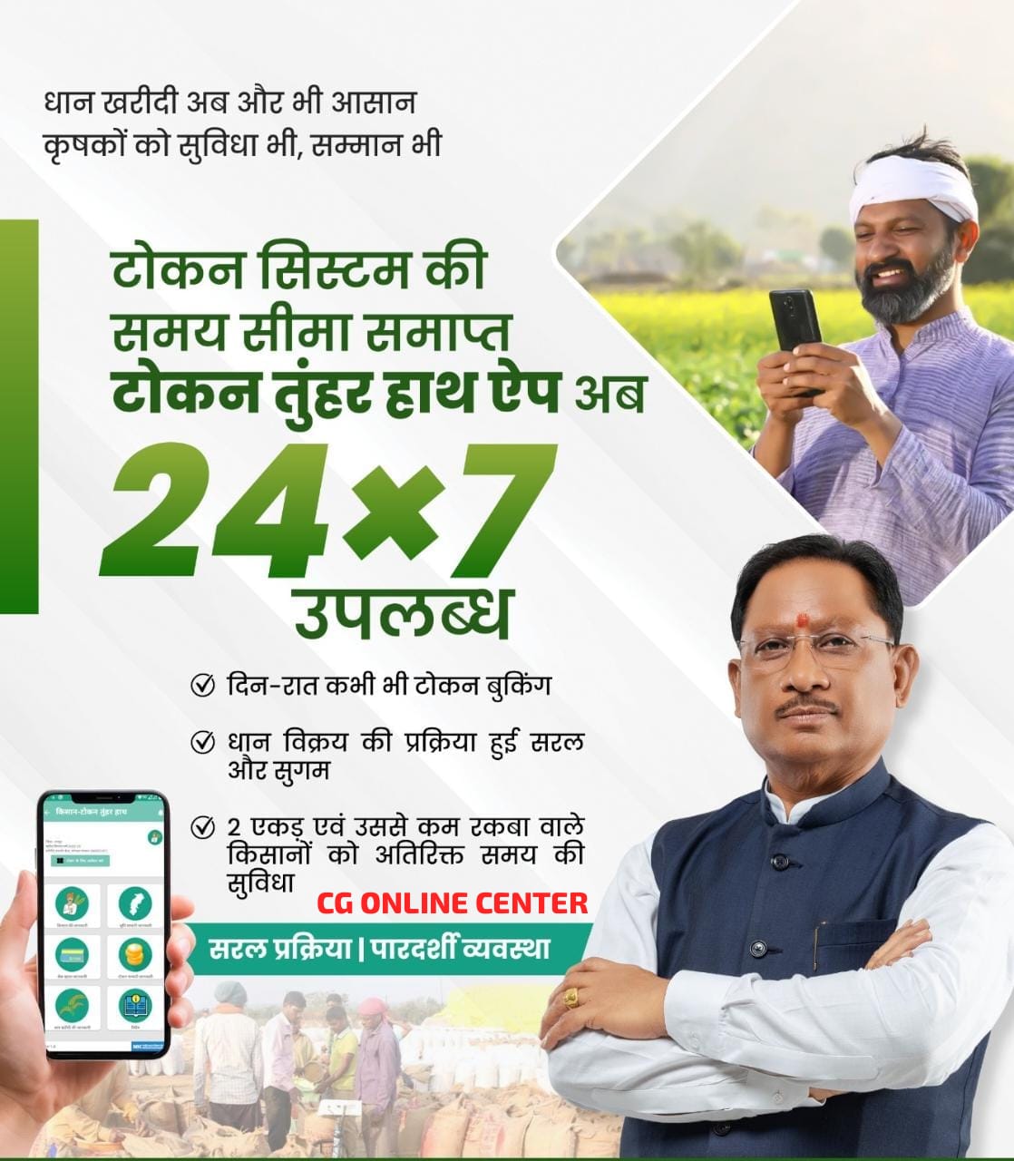 जगदलपुर। धान खरीदी को और अधिक सरल तथा सुगम बनाने के लिए राज्य सरकार ने एक महत्वपूर्ण निर्णय लिया है। किसानों की सुविधा को देखते हुए टोकन तुंहर हाथ एप को अब पूरे 24 घंटे उपलब्ध करा दिया गया है। अब टोकन बुक करने के लिए किसी निर्धारित समय की बाध्यता नहीं रहेगी। किसान अपनी सुविधा के अनुसार दिन हो या रात जब चाहें टोकन प्राप्त कर सकेंगे।