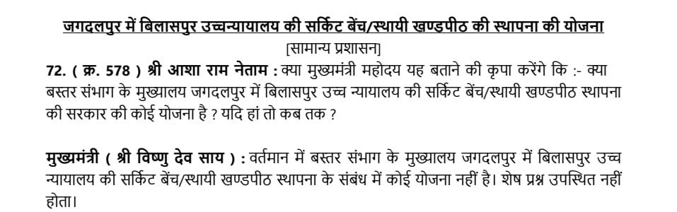 दरअसल कांकेर विधायक आशाराम नेताम ने विधानसभा के मौजूदा सत्र में पूछा था कि जगदलपुर में बिलासपुर उच्च न्यायालय की खंडपीठ कब तक स्थापित की जाएगी। इसके जवाब में मुख्यमंत्री विष्णु देव साय ने स्पष्ट कह दिया है कि जगदलपुर में उच्च न्यायालय की खंडपीठ स्थापित करने की कोई योजना नहीं है। बस्तर संभाग में आने वाले सातों जिले क्रमशः बस्तर, सुकमा, बीजापुर, दंतेवाड़ा, नारायणपुर, कांकेर और कोंडागांव लगभग पूरी तरह आदिवासी बाहुल्य जिले हैं। यहां के आदिवासियों को 25 वर्षों के बाद भी न्याय पाने के लिए लंबी दूरी तय करनी पड़ रही है। इन सातों जिलों के प्रबुद्धजन और अधिवक्ता बस्तर संभाग मुख्यालय जगदलपुर में हाईकोर्ट की खंडपीठ स्थापना की मांग लंबे समय से करते आ रहे हैं। इस संबंध में कांकेर, दंतेवाड़ा, सुकमा, बीजापुर, नारायणपुर व कोंडागांव के अधिवक्ताओं द्वारा शासन- प्रशासन स्तर पर पत्राचार भी किया जाता रहा है, लेकिन आदिवासी बाहुल्य बस्तर फिर एक बार छलने की कगार पर है क्योंकि यहां हाईकोर्ट की सर्किट बेंच तो दूर खंडपीठ भी खोलने पर भी सरकार विचार नहीं कर रही है। सोमवार को विधानसभा के शीतकालीन सत्र में सत्तारूढ़ दल भारतीय जनता पार्टी के कांकेर सीट से विधायक आशाराम नेताम खंडपीठ को लेकर सवाल लगाया, जिस पर सरकार का जवाब यहां के लोगों के लिए बेहद ही निराशाजनक है। स्वयं मुख्यमंत्री विष्णुदेव साय ने जवाब दिया है कि जगदलपुर में बिलासपुर उच्च न्यायालय का खंडपीठ नहीं खुलेगा। ज्ञात हो कि छत्तीसगढ़ राज्य गठन को 25 वर्ष हो गए हैं और उसके बावजूद बस्तर को अपेक्षित लाभ नहीं मिल रहा है। बस्तर संभाग के आदिवासियों के हजारों न्यायालयीन मामले उच्च न्यायालय बिलासपुर में लंबित है और वह वर्षों से न्याय पाने की उम्मीद में बैठे हैं।