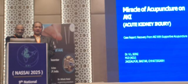 संगोष्ठी में डॉ. वीएल सोनी ने अपने व्याख्यान में बताया कि छत्तीसगढ़ में बस्तर संभाग के नारायणपुर जिले के कोलर गांव की 28 वर्षी मुन्नी बघेल किडनी जैसे गंभीर बीमारी से ग्रस्त थी। कई बड़े चिकित्सा संस्थानों में इलाज कराने के बाद उन्हें डायलिसिस की सलाह दी गई थी और रायपुर रेफर किया गया था। आर्थिक दृष्टि से रायपुर जाने में असमर्थ होने के कारण उन्होंने एक्यूपंक्चर विधि से इलाज कराने हेतु मुन्नी बघेल बस्तर संभाग के एकमात्र एक्यूपंक्चर चिकित्सा डॉ. वीएल सोनी के पास इलाज के लिए पहुंची। जब वह जांच के लिए आई तब गंभीर तौर पर किडनी इन्फेक्शन से ग्रसित थी उनके ब्लड यूरिया 180 क्रिएटिनिन की मात्रा 7.9 पाई गई थी जबकि सामान्य व्यक्ति का ब्लड यूरिया 7 से 20 एमजी एवं क्रिएटिनिन 0.7 से 1.3 एमजी होना चाहिए। इस महिला का एक्यूपंक्चर विधि से 7 दिन तक लगातार उपचार करने के पश्चात यूरिया 180 से घटकर 24 एमजी तथा क्रिएटिन 7.89 से घट कर 1.34 एमजी आ चुका था इस प्रकार किडनी जैसी घातक बीमारी का इलाज एक्यूपंचर विधि से बहुत कम खर्चे में किया जा सकता है।
