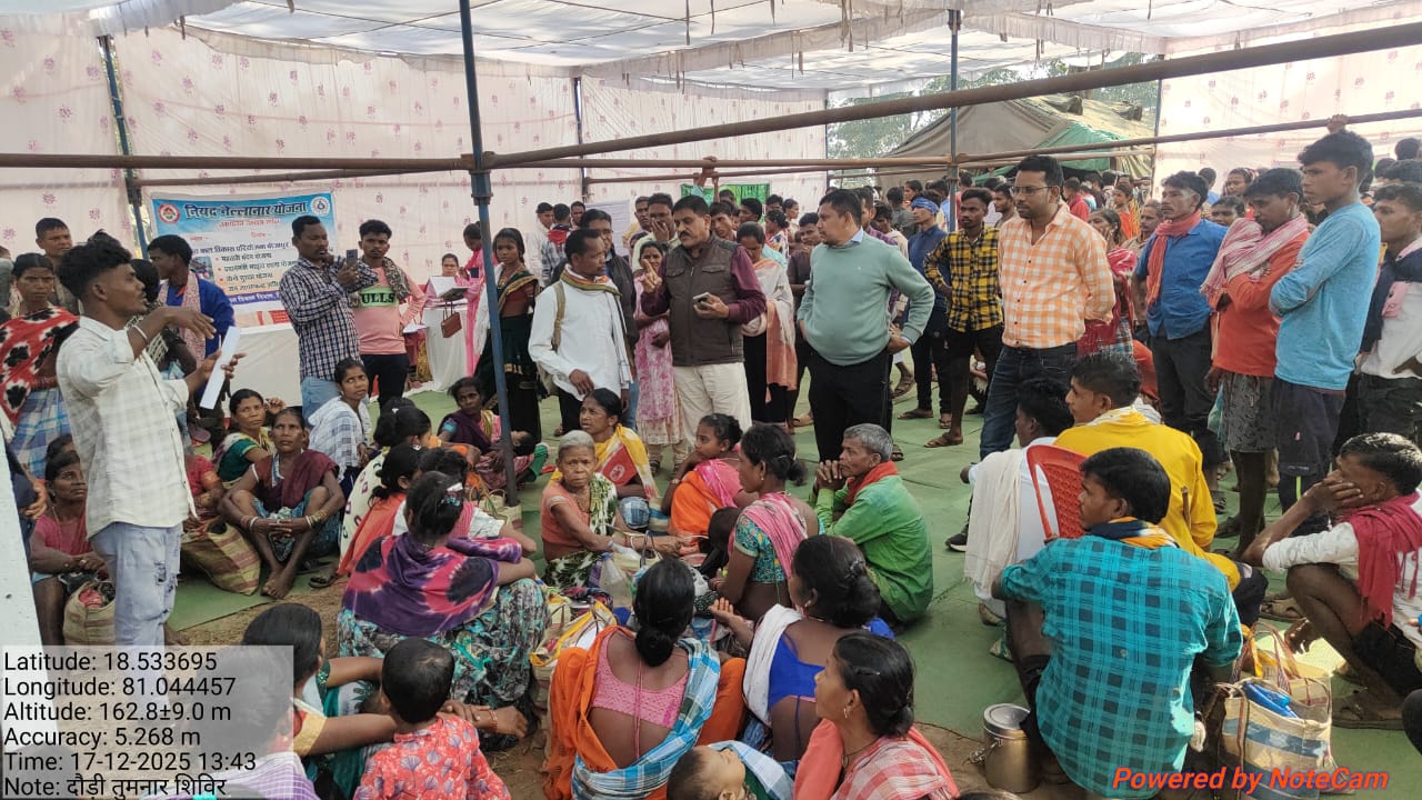 जिला कलेक्टर श्री संबित मिश्रा के निर्देश पर तथा जिला पंचायत सीईओ श्रीमती नम्रता चौबे के मार्गदर्शन में बुधवार को डौडीतुमनार में प्रथम चरण का सेचुरेशन शिविर आयोजित किया गया। जनपद पंचायत सीईओ श्री पी. आर. साहू के नेतृत्व में सभी विभागों के मैदानी अमले के साथ बीजापुर से आवापल्ली, बासागुड़ा और तर्रेम होते हुए गौटपल्ली कैम्प (जिला सुकमा) पहुंचकर शिविर का आयोजन किया गया।