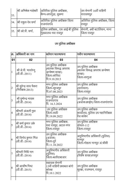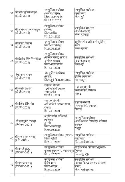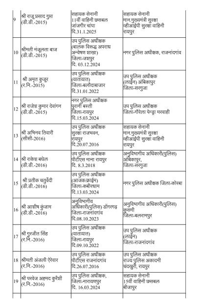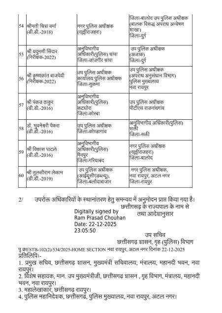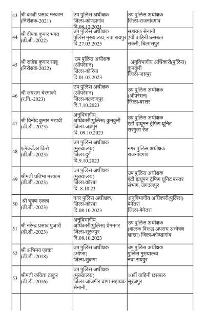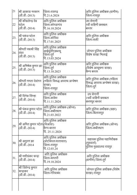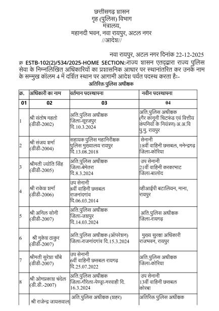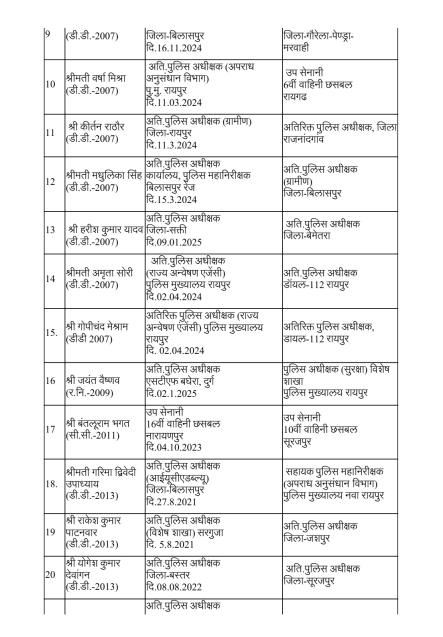 Home मुख्य ख़बरें पुलिस विभाग में बड़ी सर्जरी: 95 अधिकारियों का तबादला, 35 एएसपी और...मुख्य ख़बरेंरायपुरपुलिस विभाग में बड़ी सर्जरी: 95 अधिकारियों का तबादला, 35 एएसपी और 60 डीएसपी इधर से उधरBy News36garh Reporter - 23 December 20254970FacebookTwitterWhatsAppEmailPrintTelegramCopy URL रायपुर –राज्य सरकार ने पुलिस मकहमे में बड़ी सर्जरी करते हुए राज्य पुलिस सेवा के 95 अधिकारियों का तबादला किया है। गृह (पुलिस) विभाग की ओर से जारी आदेश के मुताबिक 35 अतिरिक्त पुलिस अधीक्षक और 60 डीएसपी स्तर के अफसरों को इधर से उधर किया गया है।