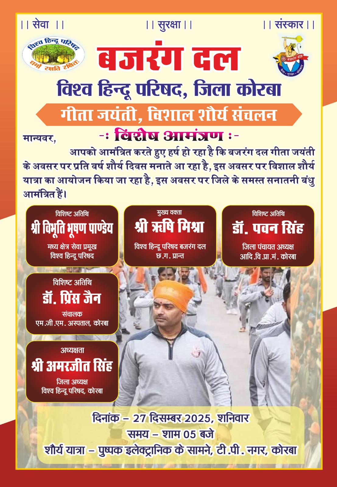 हिन्दू समाज की एकता, शौर्य और सांस्कृतिक चेतना को सशक्त करने के उद्देश्य से विश्व हिन्दू परिषद एवं बजरंग दल, कोरबा द्वारा दिनांक 27 दिसंबर को शौर्य संचलन का भव्य आयोजन किया जा रहा है।
