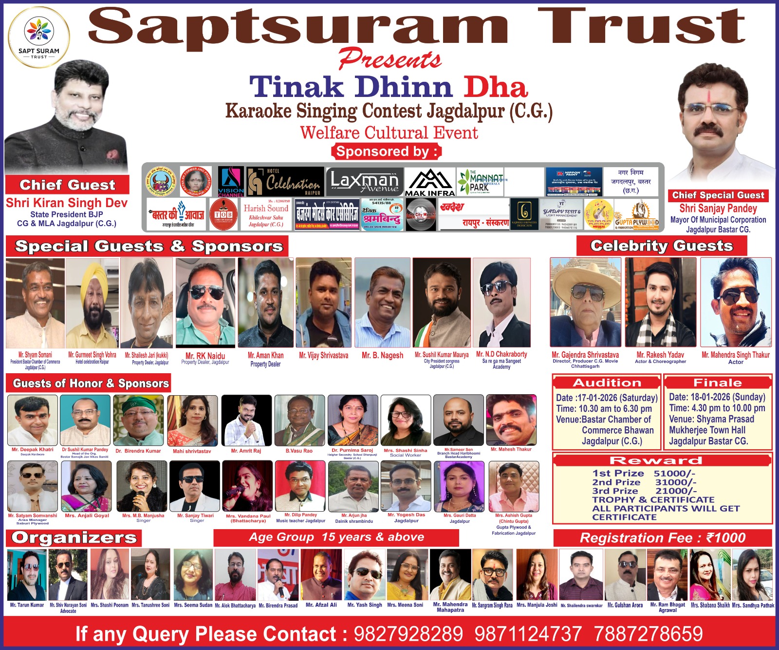 आडीशन प्रक्रिया के बाद टॉप 15 प्रतिभागियों का चयन किया जाएगा। इसके उपरांत प्रतियोगिता का ग्रैंड फिनाले 18 जनवरी को शाम 4.30 बजे से रात्रि 11 बजे तक पंडित श्यामा प्रसाद मुखर्जी टाऊन हाॅल मे होगा।फिनाले में विजयी प्रतिभागियों को नगद राशि, ट्रॉफी और प्रमाण पत्र प्रदान किए जाएंगे। प्रथम पुरस्कार 51 हजार रू., द्वितीय पुरस्कार 31 हजार तथा तृतीय पुरस्कार 21 हजार रुपए हैं। इसके अतिरिक्त टॉप 12 प्रतिभागियों को मोमेंटो व प्रमाण पत्र, तथा सभी प्रतिभागियों को प्रमाण पत्र दिए जाएंगे। कार्यक्रम में मुख्य अतिथि के रूप में विधायक किरण सिंह देग मेयर संजय पांडेय रहेंगे। विशिष्ट अतिथि एवं स्पॉन्सर श्याम सोमानी, सुशील मौर्य, श्री शैलेष जारी, आरके नायडू, अमन खान, बी. नागेश, गुरमीत सिंह होरा, डाॅ. एनडी चक्रवर्ती, विजय श्रीवास्तव सेलिब्रिटीज गजेंद्र श्रीवास्तव, राकेश यादव, महेंद्र ठाकुर होंगे। कार्यक्रम के अंत में सहयोग देने वाले सभी अतिथियों का मंच से सम्मान किया जाएगा। विशेष अतिथि माही श्रीवास्तव, अमृतराज, बी. वासु राव, महेश ठाकुर, वंदना पाॅल, एमबी मंजूषा, डाॅ. वीरेंद्र कुमार, संजय तिवारी, समीर सेन, दिलीप पांडेय, वरिष्ठ पत्रकार अर्जुन झा, योगेश दास, आशीष गुप्ता , यादव टेंट, भारत कुमार गंगादित्य, अंजलि गोयल, सत्यम सोमवंशी होंगे।आयोजक तरुण कुमार, एडवोकेट शिवनारायण सोनी, शशि पूनम, आलोक भट्टाचार्य, वीरेंद्र प्रसाद, सीमा सूदन, वीरेंद्र प्रसाद, डाॅ. आलोक भट्टाचार्य, मीना सोनी, अफजल अली, यश सिंह, संग्राम सिंह राना, महेंद्र महापात्र, शैलेंद्र स्वर्णकार, संध्या पाठक हैं। इच्छुक प्रतिभागी नीचे फोन नंबर 9827928289 व 9871124737 और 7887278659 पर पंजीयन करा सकते हैं।