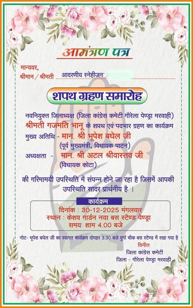 गौरेला–पेंड्रा–मरवाही जिले के पेंड्रा नगर में मंगलवार, 30 दिसंबर 2025 को जिला कांग्रेस कमेटी द्वारा भव्य शपथ ग्रहण समारोह का आयोजन किया जा रहा है। इस अवसर पर नव-नियुक्त जिला अध्यक्ष श्रीमती रजमती भान शपथ एवं पदभार ग्रहण करेंगी। कार्यक्रम को लेकर कांग्रेस कार्यकर्ताओं और समर्थकों में खासा उत्साह देखने को मिल रहा है।