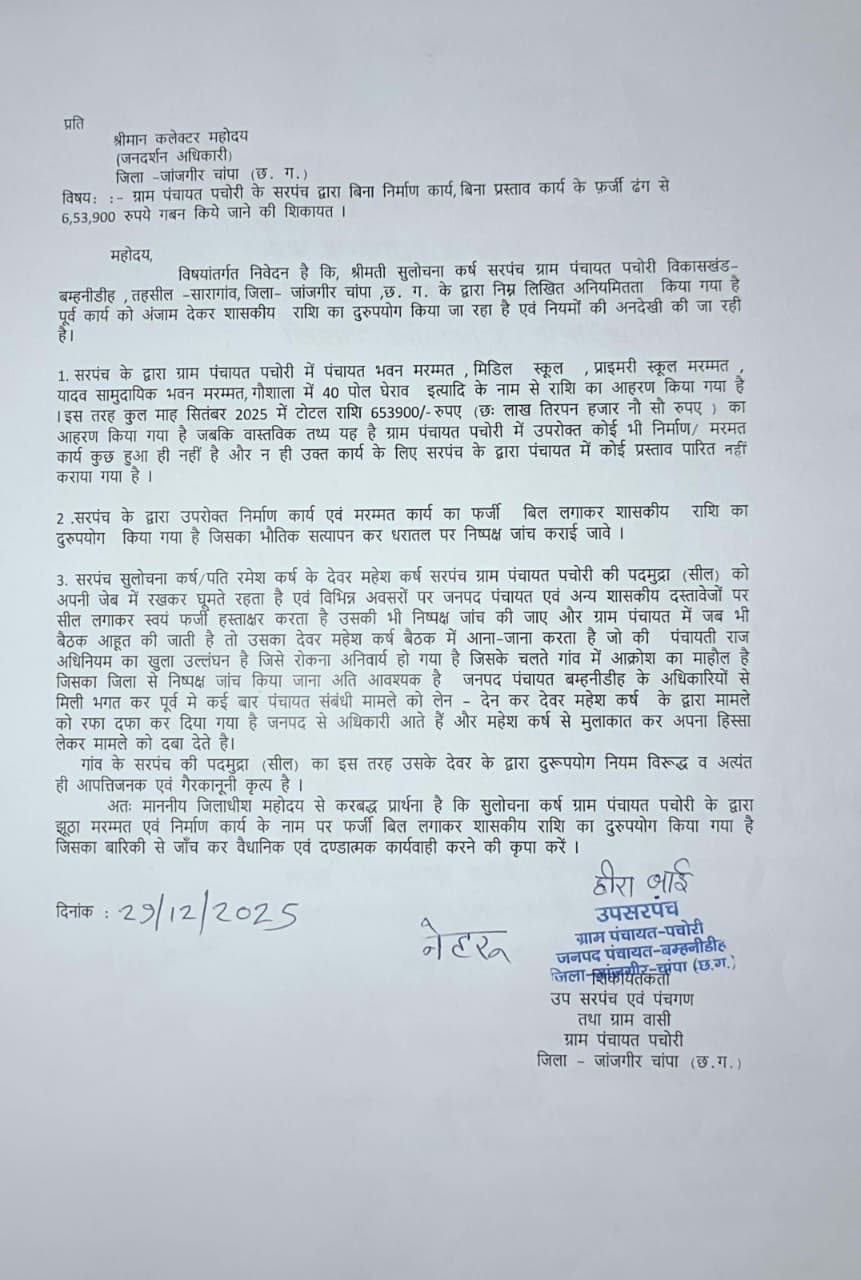 जिला जांजगीर-चांपा  29 दिसंबर 2025 जनदर्शन में  महिला उपसरपंच ने लगाया आरोप की विकासखंड बम्हनीडीह अंतर्गत ग्राम पंचायत पचोरी इन दिनों 6 लाख 53 हजार 900 रुपये के कथित घोटाले को लेकर सुर्खियों में है। पंचायत मद की शासकीय राशि को बिना किसी कार्य, बिना प्रस्ताव और बिना जनस्वीकृति के निकालने का गंभीर आरोप सामने आते ही पूरी पंचायत में हड़कंप मच गया है।