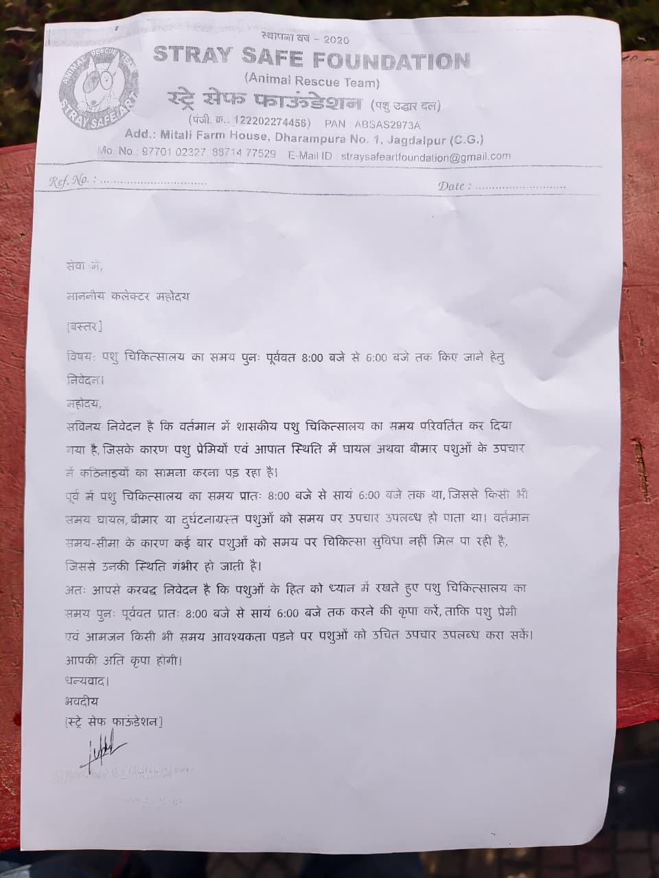 जगदलपुर। स्ट्रे सेफ फाउंडेशन, हैप्पी कामधेनु एवं बजरंग दल के प्रतिनिधि मंडल द्वारा कलेक्टर को एक ज्ञापन सौंपा गया। ज्ञापन के माध्यम से वर्तमान में पशु चिकित्सालय का समय प्रातः 8 से 12 बजे एवं सायं 4 से 5 बजे निर्धारित होने से उत्पन्न हो रही जन एवं पशुहित संबंधी समस्याओं से अवगत कराया गया।
