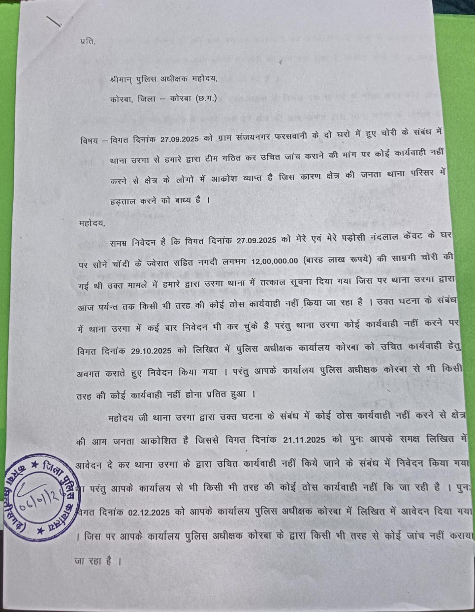 राकेश श्रीवास द्वारा कोरबा पुलिस अधीक्षक जी को तीन बार विशेष टीम गठित करने की मांग की गई है लेकिन पुलिस अधीक्षक महोदय ने इस पर कोई ध्यान नहीं दिया और आज चौथी बार 06/01/2026 को, राकेश श्रीवास ने एक सप्ताह के अंदर चोरी का सामना और चोर गिरोह नहीं पकड़ा गया तो उरगा था में अनिश्चत कॉलिंग धरने पर बैठने का ज्ञापन सौंपा गया है पुलिस अधीक्षक कार्यालय में
