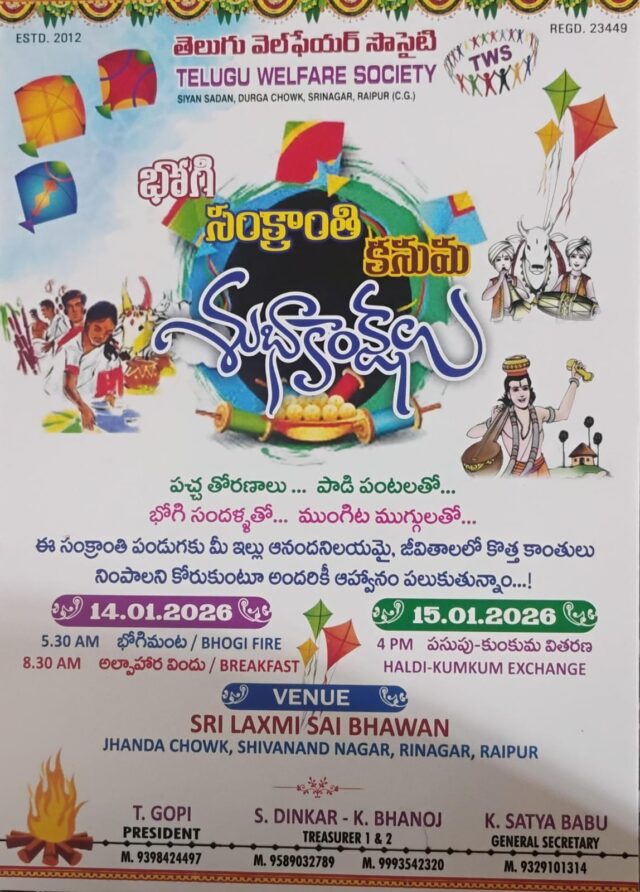 रायपुर। श्रीनगर स्थित तेलुगु वेलफेयर सोसाइटी (REGD. 23449, ESTD. 2012) की ओर से आने वाली मकर संक्रांति और कनुमा पर्व के अवसर पर रंगारंग उत्सव का आयोजन किया जा रहा है। यह कार्यक्रम 14 और 15 जनवरी 2026 को आयोजित होगा, जिसमें तेलुगु समाज सहित रायपुर के नागरिकों को भी सादर आमंत्रित किया गया है।