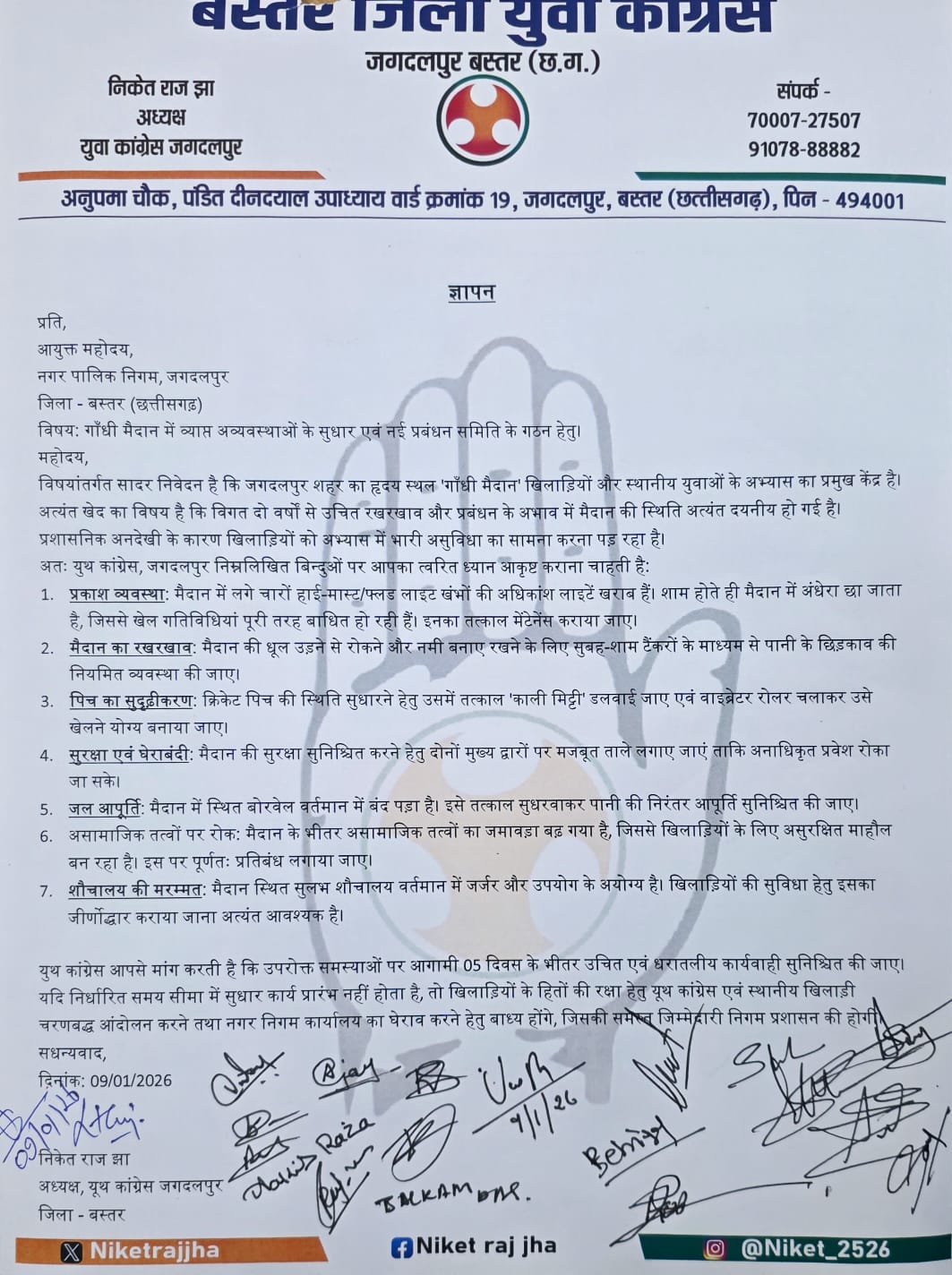 इस पर पूर्णतः प्रतिबंध लगाया जाए। मैदान स्थित सुलभ शौचालय वर्तमान में जर्जर और उपयोग के अयोग्य है। खिलाड़ियों की सुविधा हेतु इसका जीर्णोद्धार कराया जाना अत्यंत आवश्यक है। श्री झा ने कहा है कि इन समस्याओं पर आगामी 5 दिवस के भीतर उचित एवं धरातलीय कार्यवाही सुनिश्चित की जाए। यदि निर्धारित समय सीमा में सुधार कार्य प्रारंभ नहीं होता है, तो खिलाड़ियों के हितों की रक्षा हेतु यूथ कांग्रेस एवं स्थानीय खिलाड़ी चरणबद्ध आंदोलन करने तथा नगर निगम कार्यालय का घेराव करने हेतु बाध्य होंगे। इस अवसर पर नेता प्रतिपक्ष राजेश चौधरी, विक्रम सिंह डांगी, पार्षद शुभम यदु, ललिता राव, जिला उपाध्यक्ष सोनारु नाग, आकिब रज़ा, शेख सद्दाम रज़ा, वैभव नेताम, ब्लॉक अध्यक्ष रजत जोशी, आदर्श नायक, प्रभुदास नाग, प्रदीप सेठिया, एनसयूआई प्रदेश महासचिव आदित्य बिसेन महासचिव हेमंत पाण्डेय, उस्मान रज़ा, कृष्णा उपाध्याय, तरणजीत सिंह रंधावा, इंदर झज्ज, सचिव शेख जुनैद, खेमराज सेठिया, अजय पाण्डेय, तरसेम जसवाल, राज, बलराम आदि मौजूद रहे।