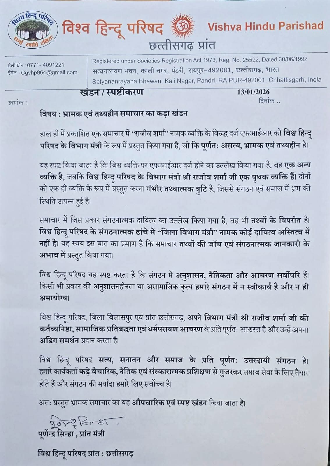 यह स्पष्ट किया जाता है कि जिस व्यक्ति पर एफआईआर दर्ज होने का उल्लेख किया गया है, वह एक अन्य व्यक्ति है, जबकि विश्व हिन्दू परिषद के विभाग मंत्री श्री राजीव शर्मा जी एक पृथक व्यक्ति हैं। दोनों को एक ही व्यक्ति के रूप में प्रस्तुत करना गंभीर तथ्यात्मक त्रुटि है, जिससे संगठन एवं समाज में भ्रम की स्थिति उत्पन्न हुई है।