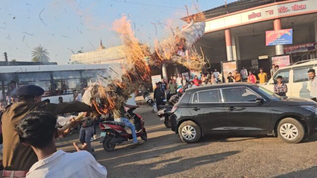 बस्तर जिले के दंतेवाड़ा जिले की व्यापार नगरी गीदम में राजनीतिक फिजा बदरंग हो गई है। सरकार पर लगातार हमलावर कांग्रेस कार्यकर्ताओं ने भाजपा जिलाध्यक्ष का पुतला दहन किया। बस स्टैंड में किए गए प्रदर्शन में बड़ी संख्या में कांग्रेस कार्यकर्ताओं ने जमकर नारेबाज़ी की। कांग्रेस नेताओं का आरोप है कि गीदम क्षेत्र में लगातार अपराध, मारपीट और गुंडागर्दी की घटनाएं बढ़ रही हैं, जिसके लिए सीधे तौर पर भाजपा जिम्मेदार है। कांग्रेस ने भाजपा जिला अध्यक्ष पर बुजुर्ग सर्राफा व्यापारी के साथ मारपीट का आरोप लगाते हुए कहा कि कड़ी कार्रवाई नहीं होने पर प्रदर्शन जारी रहेगा।पुतला दहन की सूचना मिलते ही पुलिस मौके पर पहुंची और स्थिति को नियंत्रित किया।