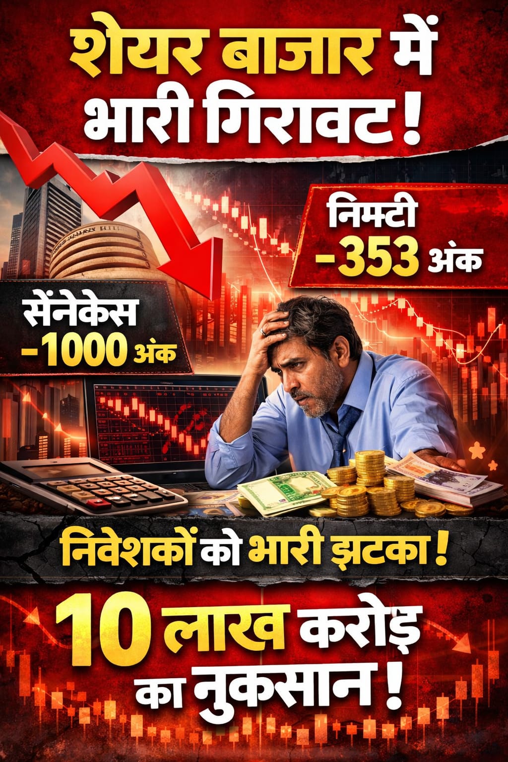 शेयर बाजार में आज भारी गिरावट का दौर देखने को मिला। बीएसई सेंसेक्स 1000 अंक गिरकर बंद हुआ, जबकि एनएसई निफ्टी में 353 अंकों की कमी आई। इस लुढ़के बाजार से निवेशकों को 10 लाख करोड़ रुपये से अधिक का झटका लगा।