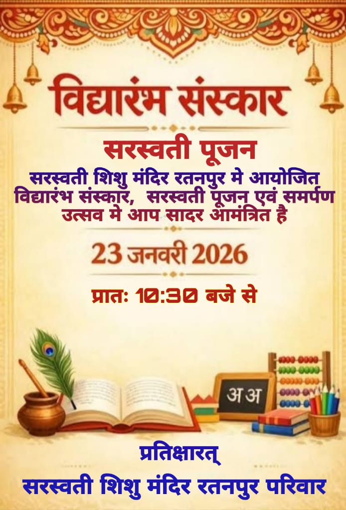 सरस्वती शिशु मंदिर रतनपुर में 23 जनवरी 2026 को बसंत पंचमी मनाई जाएगी, जो विद्या की देवी सरस्वती को समर्पित है और विद्यारंभ संस्कार (बच्चों की शिक्षा का शुभारंभ) के लिए अत्यंत शुभ दिन है. इस दिन स्कूलों, कॉलेजों और घरों में धूमधाम से सरस्वती पूजा होगी, जहाँ पीले वस्त्र पहनकर, पीले फूल और भोग अर्पित किए जाएंगे. गजकेसरी योग जैसे शुभ संयोग बन रहे हैं, जिससे शिक्षा और कला के क्षेत्र में तरक्की के अवसर हैं, और कई जगहों पर <तिलकोत्सव > और अक्षरारंभ जैसे कार्यक्रम होंगे खास