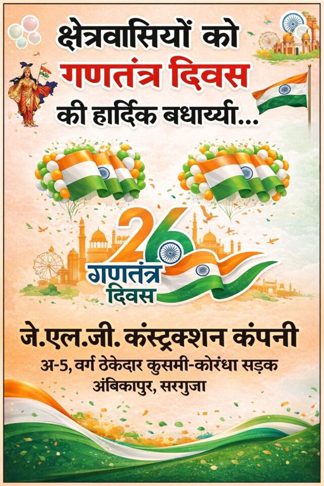 जे एल जी कंस्ट्रक्शन कंपनी अंबिकापुर ने दी प्रदेश वासियों को गणतंत्र दिवस की बधाइयाँ