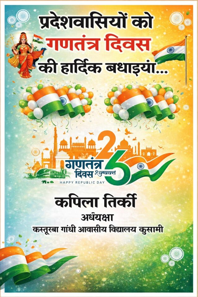 Home चर्चा में कस्तूरबा गाँधी आवासीय विद्यालय कुसमी की अध्यक्षा कपिला तिर्की ने दी गणतंत्र...चर्चा मेंकस्तूरबा गाँधी आवासीय विद्यालय कुसमी की अध्यक्षा कपिला तिर्की ने दी गणतंत्र दिवस की शुभकामनाएँ।By News36garh Reporter - 26 January 202660FacebookTwitterWhatsAppEmailPrintTelegramCopy URL तिरंगे की शान में झुक जाए ये आसमान,संविधान से मिले सपनों को दें पहचान।हर दिल में बसे देश के लिए सम्मान।आप और आपके परिवार कोगणतंत्र दिवस की शुभकामनाएँ।सौजन्य – युसूफ खान (बलरामपुर संवाददाता)