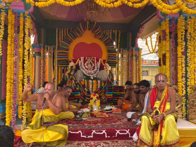 जगदलपुर। बालाजी मंदिर में वार्षिक महोत्सव के पांचवे दिन सुबह से पूजा-अर्चना शुरू हुई। सुप्रभात पूजा के बाद पूजा मंडप में भगवान का फूलों से अलंकरण कर महिलाओं ने सामूहिक रूप से मंदिर परिसर में कुमकुम पूजा की। मंदिर में चल रहे 7 दिवसीय आयोजन के पांचवें दिन हुई कुमकुम पूजा के लिये टेंपल कमेटी की ओर से पूजन सामग्री दी गई थी। महिलाओं ने अपने सुहाग एवं परिवार की दीर्घायु के लिए कुमकुम पूजा की। कुमकुम पूजा में मंदिर परिसर मेंं 1 हजार से महिलाओं ने भाग लिया। पूजा विधान आंध्रप्रदेश से पंडित रामाचार्युलु एवं साथी पंडितों ने संपन्न करवाया। बता दें कि गुरुवार रात में श्रीनिवास कल्याणम महोत्सव संपन्न हुआ था। रात डेढ बजे तक जारी पूजा में भी बड़ी संख्या में श्रद्धालु उपस्थित रहे। गुरुवार को ही संपन्न हुए महा अभिषेक के बाद देव प्रतिमाओं को रत्न कवच पहनाये गये।