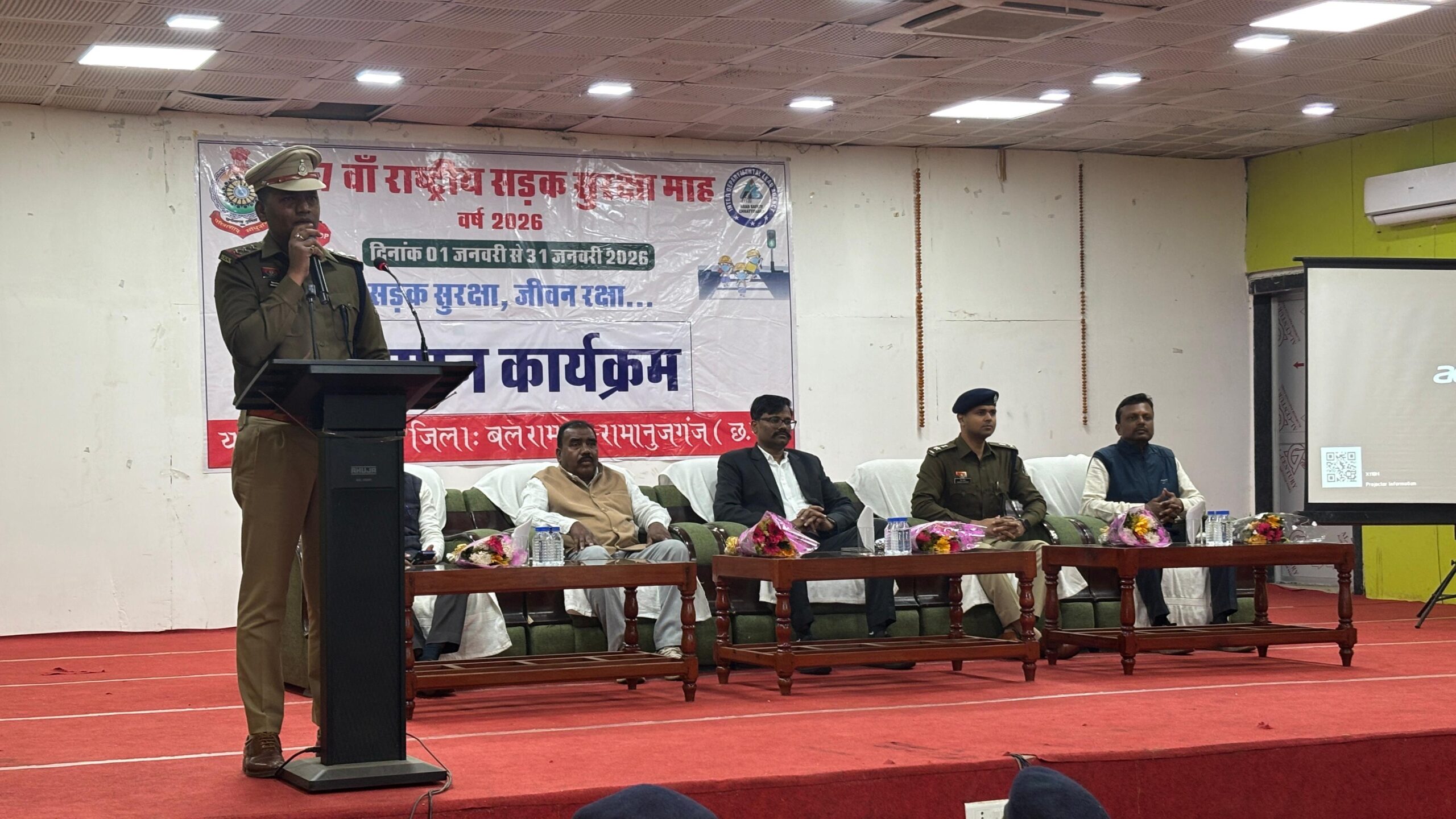 37 वां राष्ट्रीय सड़क सुरक्षा माह का समापन कार्यक्रम आज दिनांक 31. 01.2026 को जिला बलरामपुर के ऑडिटोरियम हॉल साप्ताहिक बाज़ार के सभाकक्ष में आयोजित किया गया। जिसमें मुख्य अतिथि के रूप में कलेक्टर बलरामपुर राजेन्द्र कटारा, पुलिस अधीक्षक वैभव बैंकर, नगर पालिका अध्यक्ष लोधी राम एक्का, नगर पालिका उपाध्यक्ष श्री दिलीप सोनी रहे। समापन कार्यक्रम का शुभारंभ यातायात प्रभारी विमलेष कुमार देवांगन द्वारा माह 01 जनवरी से 31 जनवरी तक आयोजित 37 वां राष्ट्रीय सड़क सुरक्षा माह 2026 कार्यक्रम की रूप रेखा के विमोचन के साथ गया।