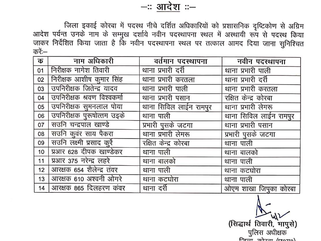 पुलिस विभाग में हुए इस फेरबदल को लेकर उम्मीद जताई जा रही है कि इससे जिले की कानून-व्यवस्था, अपराध नियंत्रण और पुलिसिंग व्यवस्था में और सुधार देखने को मिलेगा। तबादला सूची में शामिल अधिकारियों और कर्मचारियों के नाम और उनकी नई पदस्थापना की जानकारी नीचे दी गई है।