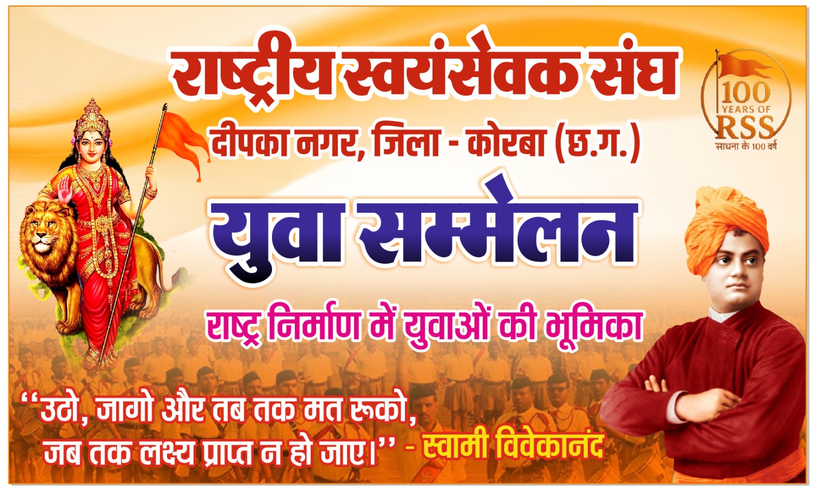 राष्ट्रीय स्वयंसेवक संघ के शताब्दी वर्ष के उपलक्ष्य में तथा स्वामी विवेकानंद जयंती के अवसर पर दीपका नगर में एक भव्य युवा सम्मेलन का आयोजन किया जा रहा है। यह सम्मेलन शनिवार, 7 फरवरी 2026 को सरस्वती शिशु मंदिर, दीपका में दोपहर 2 बजे से प्रारंभ होगा।
