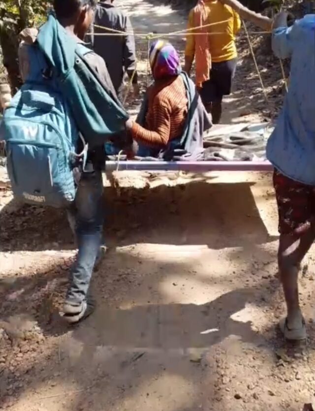 बलरामपुर (कुसमी)यह तस्वीर सिर्फ एक बीमार महिला की नहीं है… यह उस व्यवस्था पर करारा तमाचा है जो गांव-गांव तक विकास पहुंचाने के दावे तो करती है। लेकिन कुसमी विकासखंड के बालापानी गांव में एक गंभीर रूप से बीमार महिला को खटिया पर बैठाकर चार ग्रामीणों ने कंधे पर उठाया एक आदमी खाने पिने का समाग्री और कई किलोमीटर पैदल चलकर लक्ष्मणपुर तक पहुंचाया। कारण साफ है गांव तक सड़क नहीं है। 108 एम्बुलेंस सेवा गांव के भीतर नहीं पहुंच सकी। जब तक मरीज को मुख्य सड़क तक लाया गया, तब जाकर उसे अस्पताल ले जाया जा सका।