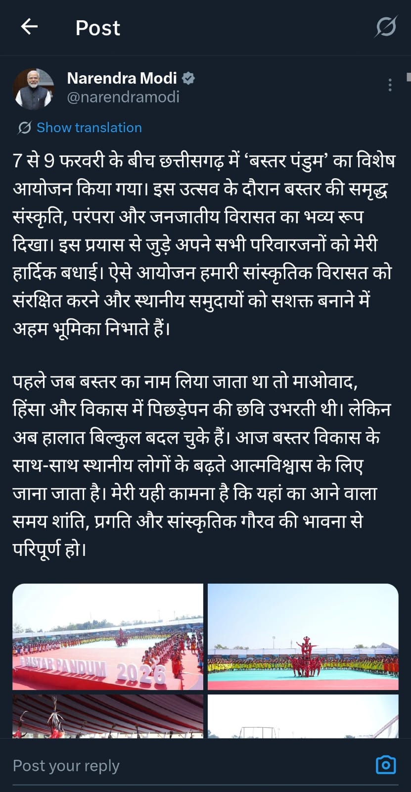 श्री मोदी ने अपने पोस्ट में लिखा कि 7 से 9 फरवरी के बीच आयोजित ‘बस्तर पंडुम’ में बस्तर की समृद्ध संस्कृति, परंपरा और जनजातीय विरासत का भव्य प्रदर्शन देखने को मिला। उन्होंने कहा, “एक समय था जब बस्तर का नाम आते ही माओवाद, हिंसा और पिछड़ेपन की तस्वीरें सामने आती थीं, लेकिन अब हालात पूरी तरह बदल चुके हैं। आज बस्तर न केवल अपने विकास के लिए, बल्कि स्थानीय लोगों के बढ़ते आत्मविश्वास के लिए जाना जाता है।” प्रधानमंत्री श्री मोदी ने इस सफल आयोजन के लिए छत्तीसगढ़ के लोगों को बधाई दी और कामना की कि आने वाला समय इस क्षेत्र के लिए शांति, प्रगति और सांस्कृतिक गौरव से भरा हो।