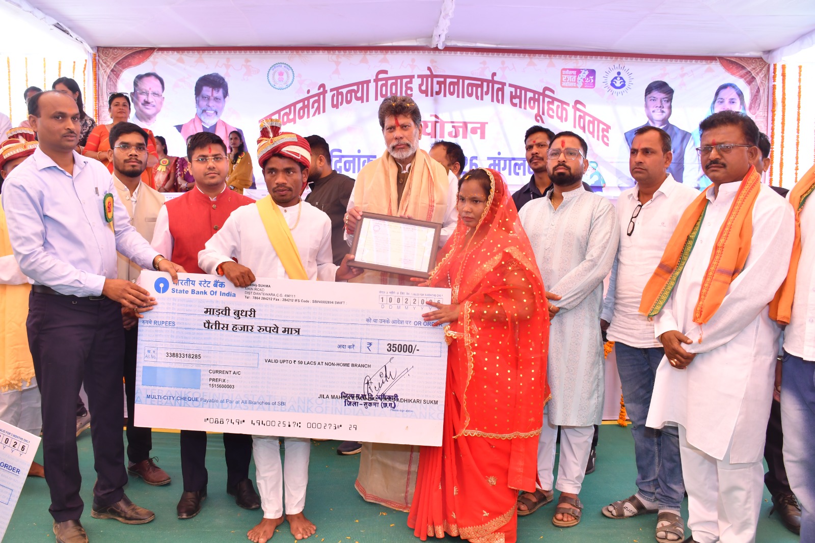 सुकमा, 10 फरवरी 2026/मुख्यमंत्री श्री विष्णुदेव साय के निर्देशन में मुख्यमंत्री कन्या विवाह योजना के अंतर्गत मंगलवार को हड़मा स्टेडियम, सुकमा में भव्य सामूहिक विवाह कार्यक्रम का आयोजन किया गया, जिसमें 107 जोड़े में कार्यक्रम का एक विशेष और भावनात्मक आकर्षण एक आत्मसमर्पित जोड़े का विवाह रहा, जिसने उपस्थित जनसमूह को गहराई से प्रभावित किया। ग्राम दोर्रामंगू, पंचायत मेहता निवासी वर मगडू एवं वधु माड़वी बुधारी ने मुख्यमंत्री कन्या विवाह योजना के अंतर्गत वैदिक रीति-रिवाजों के साथ विवाह बंधन में बंधकर अपने जीवन की नई शुरुआत की।