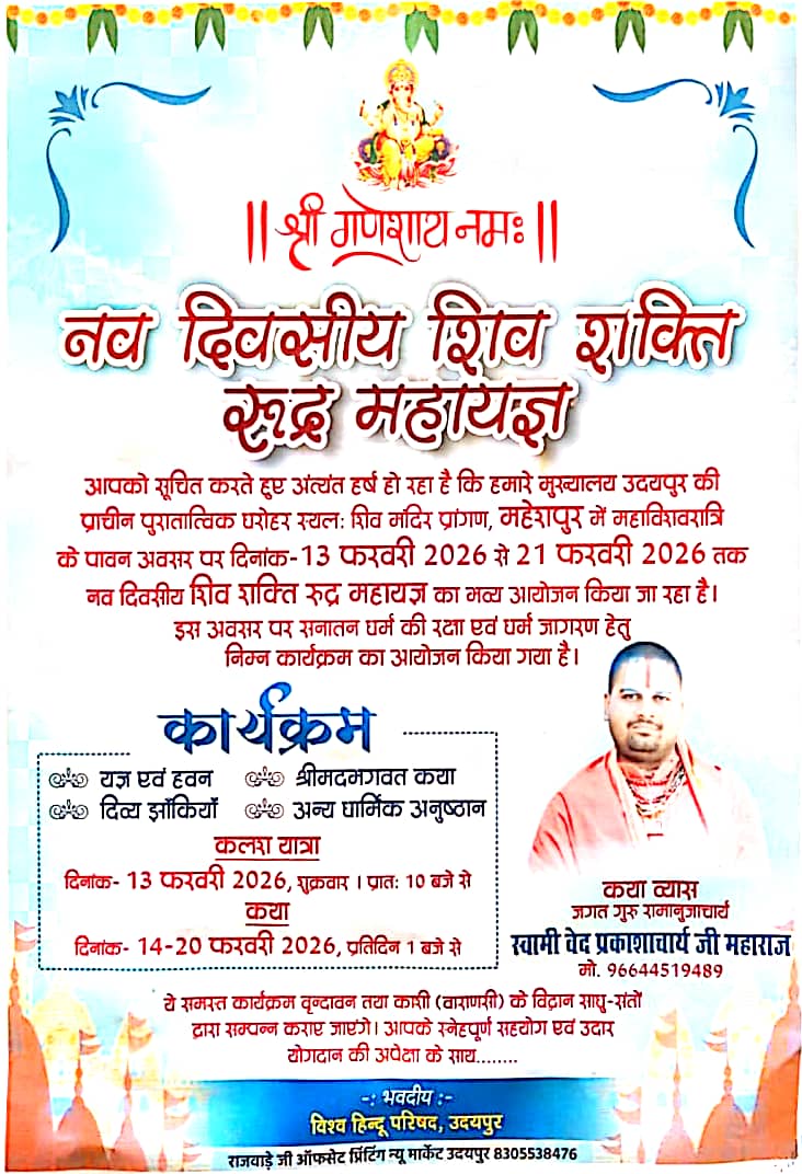 सरगुजा जिले के वनांचल क्षेत्र उदयपुर विकासखंड अंतर्गत ग्राम महेशपुर स्थित प्राचीन पुरातात्विक धरोहर शिव मंदिर प्रांगण में 13 फरवरी से 21 फरवरी 2026 तक नव दिवसीय शिव शक्ति रुद्र महायज्ञ का भव्य आयोजन किया जाएगा। महाशिवरात्रि के पावन अवसर पर आयोजित इस धार्मिक अनुष्ठान का उद्देश्य धर्म रक्षा एवं धर्म जागरण बताया गया है।