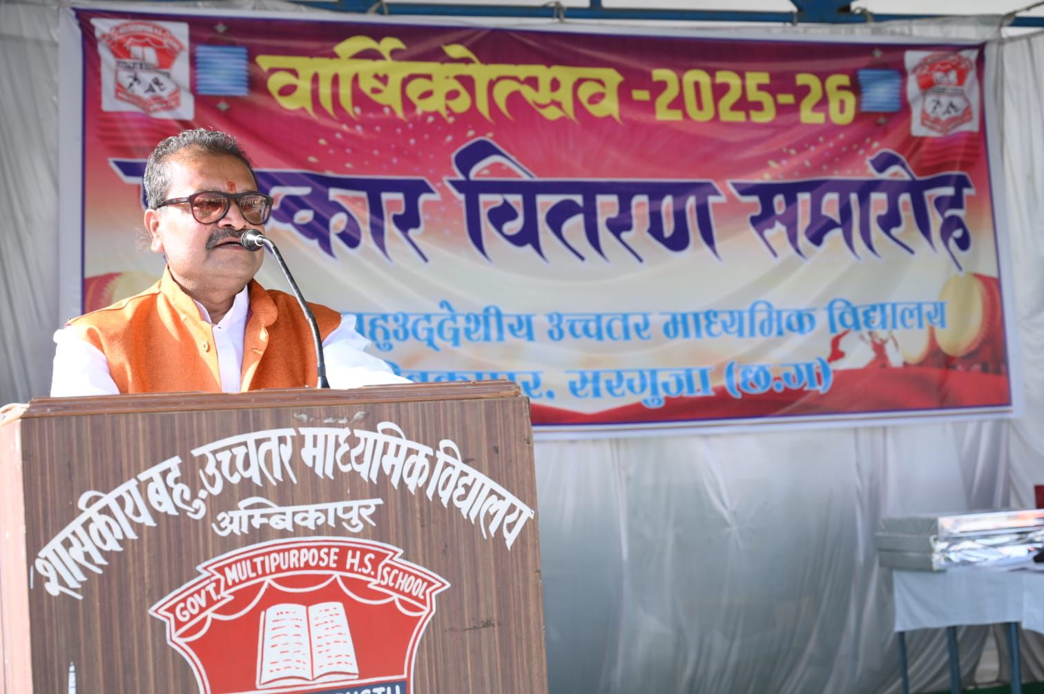 शहर के प्रतिष्ठित एवं 112 वर्ष पूर्ण कर चुके प्राचीनतम विद्यालय शासकीय बहुउद्देशीय उत्तर माध्यमिक विद्यालय अंबिकापुर में 11 फरवरी 2026 को वार्षिक उत्सव एवं पुरस्कार वितरण समारोह बड़े उत्साह और जोश के साथ मनाया गया l सांस्कृतिक कार्यक्रमों की प्रस्तुति ने मंच पर इन्द्रधनुष के रंगों की छटा बिखेरी l मुख्य अतिथि अभिमन्यु गुप्ता (अध्यक्ष SMDC ) , विकास पाण्डेय जी (सचिव SMDC ), रूपेश दुबे , संजीव वर्मा , सुश्री बबली नेताम, श्रीमती सीमा कश्यप की उपस्थिति से स्कूल गौरवांवित हुआ l इस अवसर पर अभिवावक और छात्र छात्राएँ उपस्थित रहे l मुख्य अतिथि के आगमन पर छात्राओं द्वारा तिलक एवं पुष्प वर्षा करते हुए अतिथियों का अभिवादन किया गया l दीप प्रज्ज्वलित करके कार्यक्रम का शुभारम्भ हुआ l इस के बाद स्वागत नृत्य प्रस्तुत किये गए।