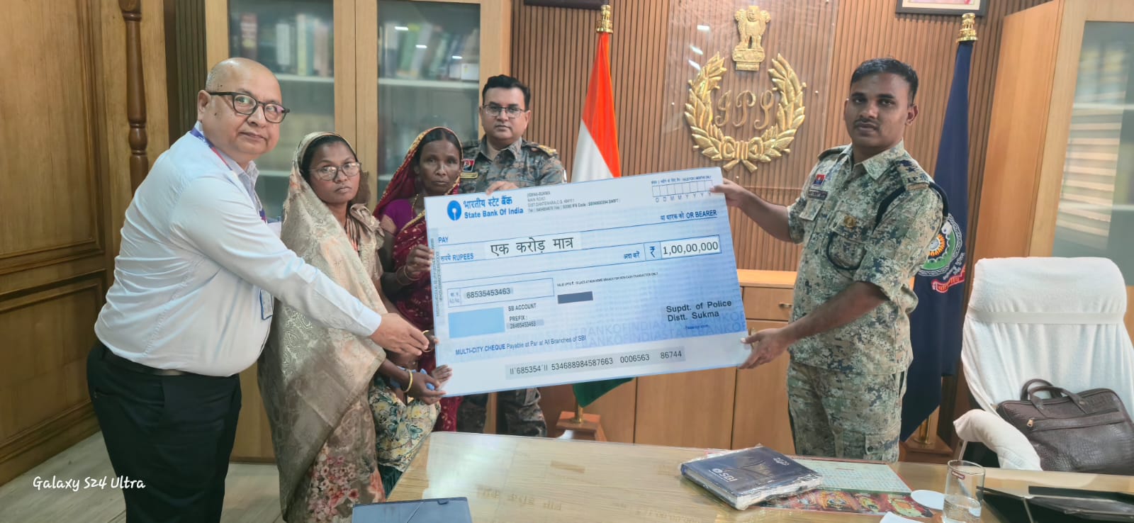 आज दिनांक 16-02-2026 को स्व. रामेश्वर नेगी की पत्नी श्रीमती सुनीता नेगी को श्री किरण चव्हाण, पुलिस अधीक्षक, जिला सुकमा, श्री अभिषेक वर्मा, अतिरिक्त पुलिस अधीक्षक, जिला सुकमा एवं श्री प्रवीण झा, शाखा प्रबंधक, भारतीय स्टेट बैंक, सुकमा, जिला सुकमा द्वारा बीमा राशि रुपये 1,00,00,000-00 (एक करोड़) मात्र का भुगतान किया गया।
