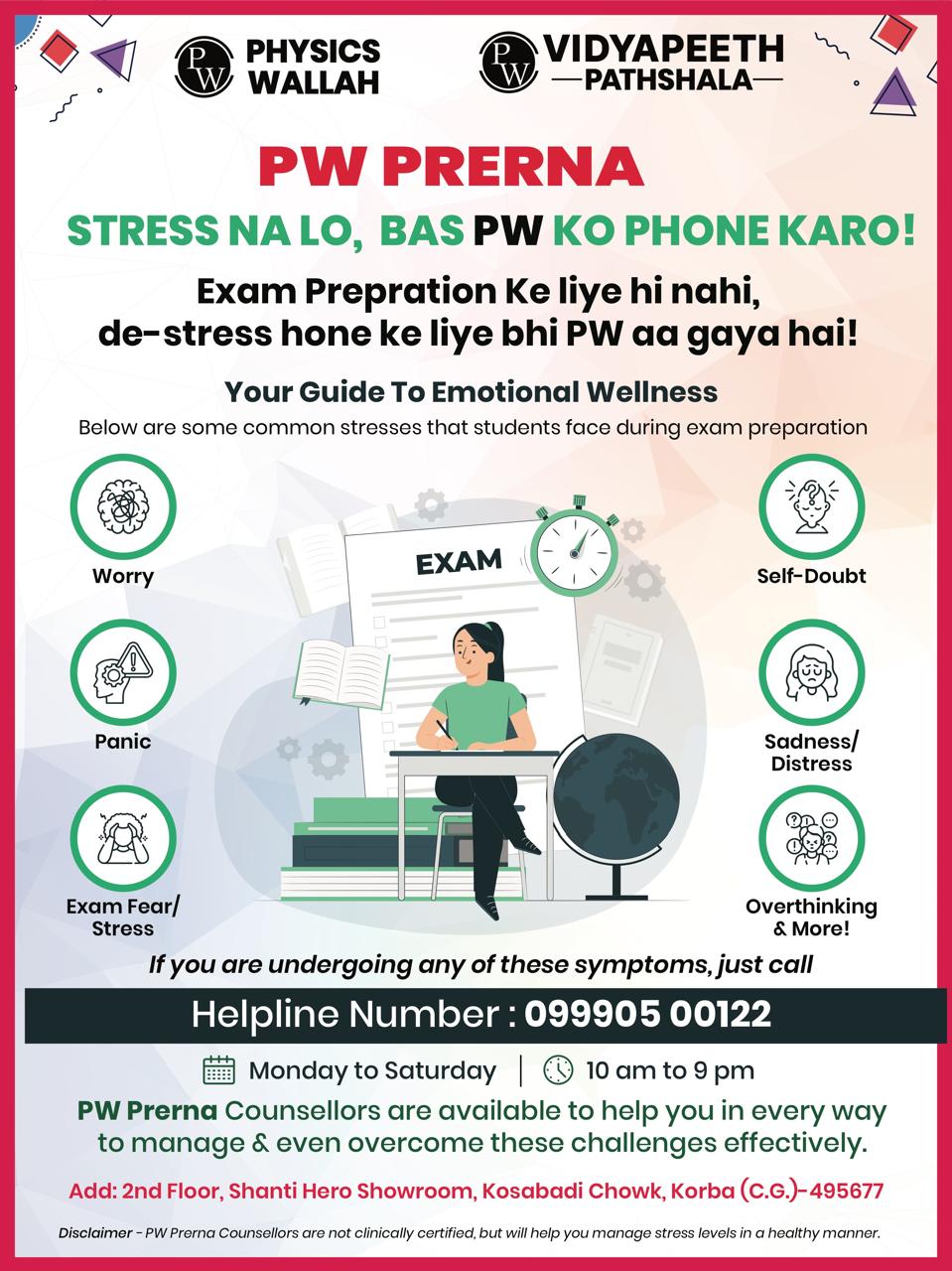 संस्थान ने अभिभावकों और विद्यार्थियों से अपील की है कि यदि वे या उनके बच्चे किसी भी प्रकार के परीक्षा तनाव से गुजर रहे हों, तो बिना झिझक इस हेल्पलाइन का उपयोग करें। या फिर PW कोरबा सेंटर मैं आकर विशेष मार्गदर्शन प्राप्त करे