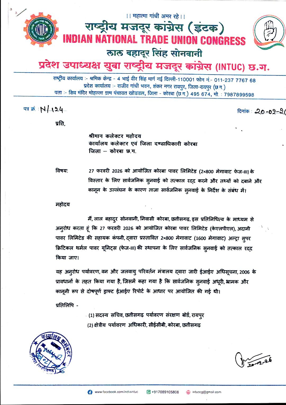 यूथ INTUC के प्रदेश उपाध्यक्ष लाल बहादुर सोनवानी ने आज कोरबा पावर लिमिटेड (KPL) की प्रस्तावित 2×800 मेगावाट (1600 मेगावाट) फेज-III विस्तार परियोजना के विरुद्ध विस्तृत लिखित आपत्ति प्रस्तुत की। यह परियोजना Adani Power Limited की सहायक कंपनी द्वारा संचालित की जा रही है।