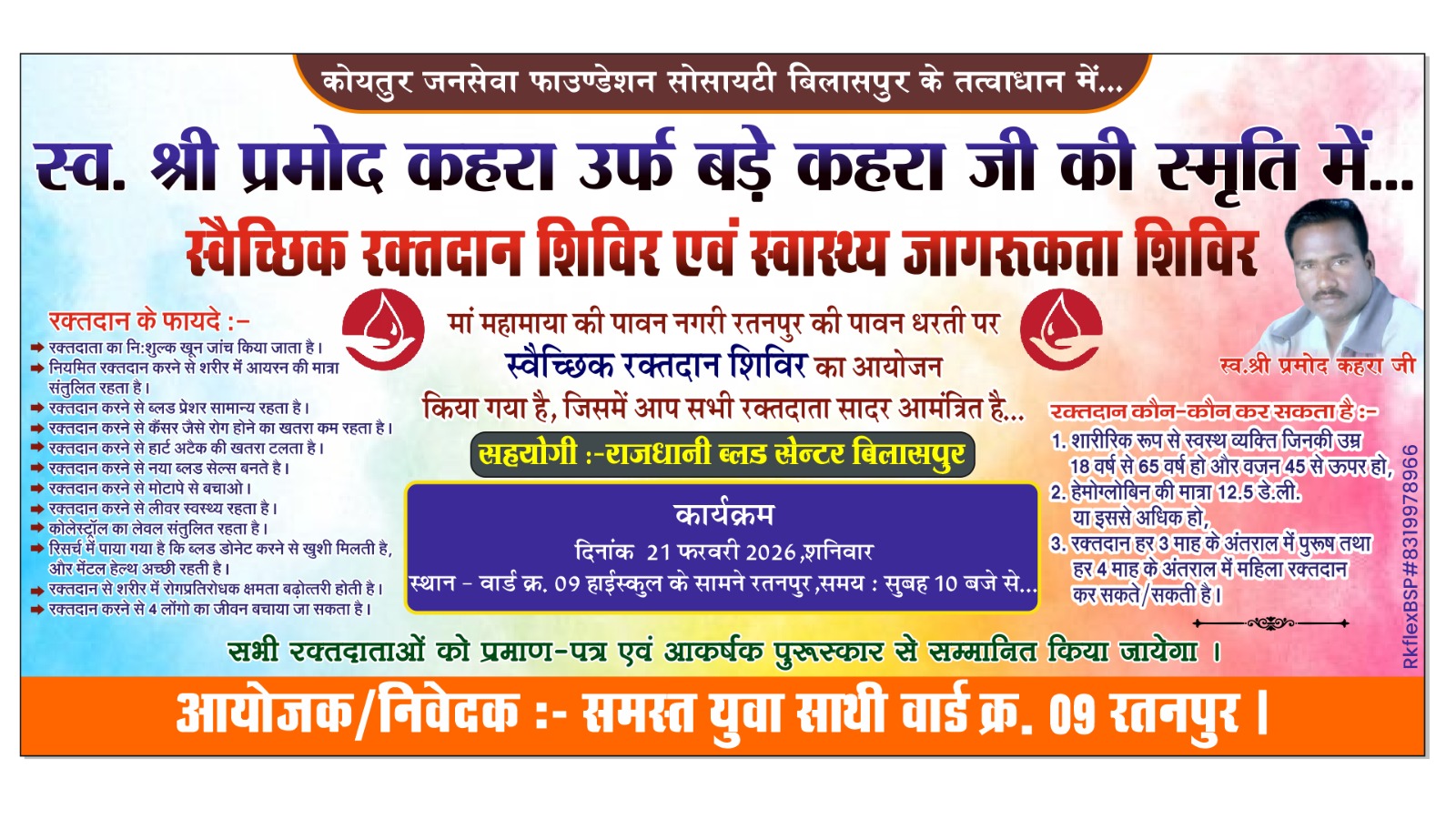 विमल सोनी/रतनपुर। वार्ड क्रमांक 9 के युवाओं एवं स्थानीय सामाजिक संगठनों द्वारा स्वर्गीय प्रमोद कहारा उर्फ ‘बड़े कहरा’ की पुण्य स्मृति में 21 फरवरी को विशाल रक्तदान शिविर का आयोजन किया जा रहा है। यह शिविर रतनपुर हाईस्कूल के सामने स्थित प्रांगण में आयोजित हो रहा है, जहां नगर एवं आसपास के ग्रामीण क्षेत्रों के लोगों से अधिक से अधिक संख्या में भाग लेने की अपील की गई है।