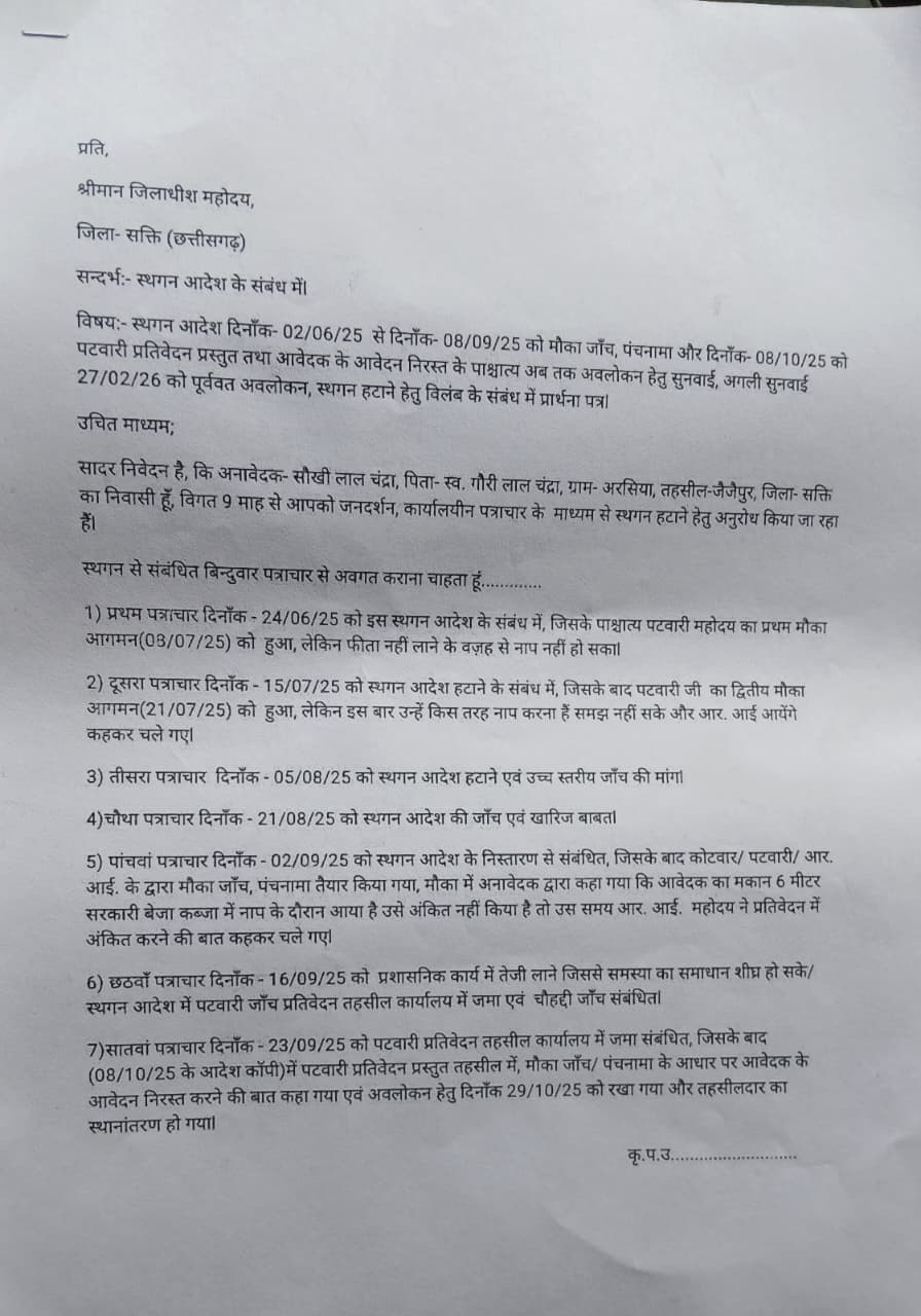इसके आधार पर 08 अक्टूबर 2025 को तहसीलदार द्वारा आवेदक का आवेदन निरस्त कर दिया गया। हालांकि इसके बाद से प्रकरण में पुनः सुनवाई एवं अवलोकन की प्रक्रिया जारी है।
