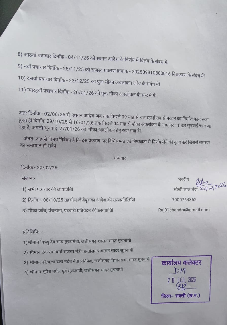 प्राप्त जानकारी के अनुसार दिनांक 02 जून 2025 को संबंधित प्रकरण में स्थगन नोटिस जारी की गई थी। बताया गया है कि इसके बाद 20 जून 2025 को अनावेदक द्वारा तहसील कार्यालय में जवाब प्रस्तुत किया गया।